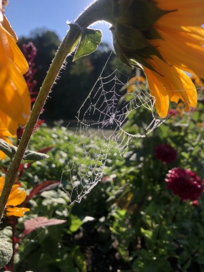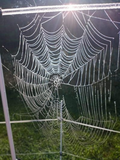 Carrie and I arrived at the farm one morning to these elaborate very large spider webs. I was wondering why now, so I looked up spider webs in Autumn. There are a couple of reasons, one being the nights are now longer, so they have more time to spin. Since I don’t have arachnophobia, and Carrie is not afraid of anything in the natural world, we ran from web to web admiring the spiders’ artwork. How lucky we are to arrive at the farm each day and watch what has been going on while we were away.