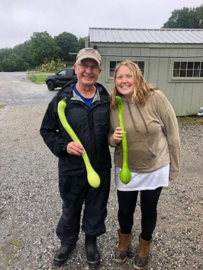 We had another bountiful harvest again this week–over 1,000 pounds donated, which edges us towards 12,000 so far this year. The Monday gleaners came on Tuesday and braved the still wet conditions from the inch and a half of rain we got on Labor Day. A few of them walked away with squash prizes. Don’t they look happy?!
