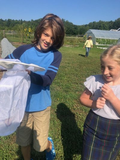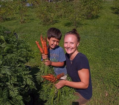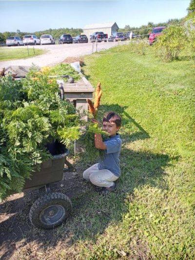 Shanti and Anna also came to help us on Friday. They helped by gleaning carrots and were so happy to find so many big ones. Shanti thought he could hide behind a handful, but came out to show off his carrots in a photo with his Mom. We love these little helpers.