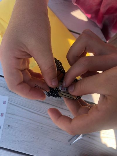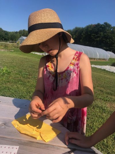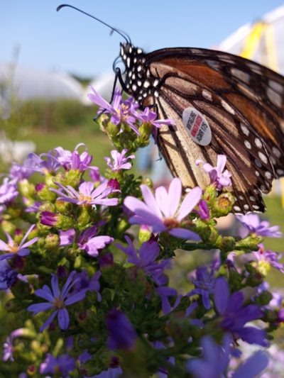 Our Friday was crazy busy as usual. We had our group of now 4th graders from the Waldorf school come back for a Monarch butterfly lesson with Carrie. Carrie took them around the farm to let them see what has been growing since we last saw them at the end of the spring. Carrie has been very excited to share an experience she had tagging Monarch butterflies. So after a very detailed explanation of how and why we were tagging, the kids set off! Around the farm they ran in pairs, sharing nets. Three Monarchs were successfully tagged and released. I believe no butterflies were harmed in the process of this endeavor! I was able to take this photograph of a tagged butterfly resting after being tagged. This was so exciting for everyone at the farm on Friday, adults and children alike.