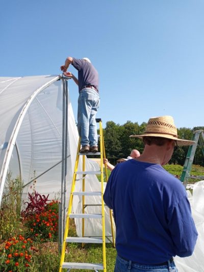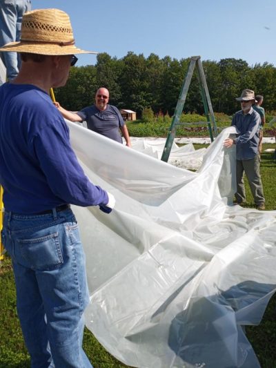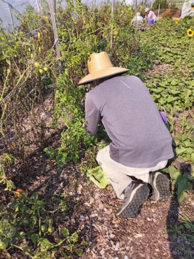 We accomplished a couple of big tasks with our Saturday volunteers. Cleaning out more tomato vines, planting lettuce, and sowing cover crop mixes. Carrie wanted to experiment with sowing a cover crop mix directly into squash vines still in the garden. The squash needed a little more time so everyone helped weed, sow the seeds and then rake them in the best they could amongst the vines. This way we are ahead 2 weeks with getting the seeds in the ground.