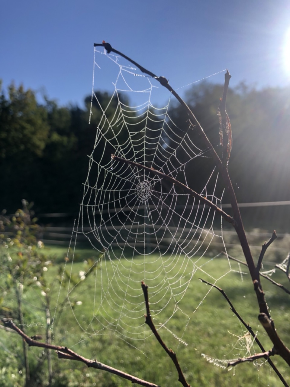 Carrie and I arrived at the farm one morning to these elaborate very large spider webs. I was wondering why now, so I looked up spider webs in Autumn. There are a couple of reasons, one being the nights are now longer, so they have more time to spin. Since I don’t have arachnophobia, and Carrie is not afraid of anything in the natural world, we ran from web to web admiring the spiders’ artwork. How lucky we are to arrive at the farm each day and watch what has been going on while we were away.