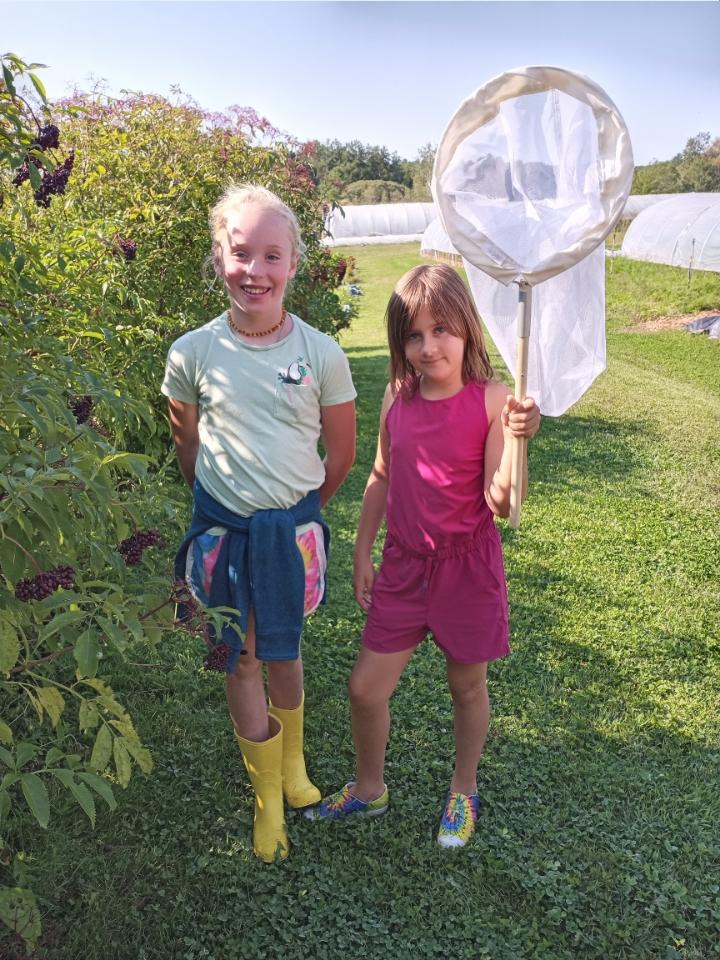 Our Friday was crazy busy as usual. We had our group of now 4th graders from the Waldorf school come back for a Monarch butterfly lesson with Carrie. Carrie took them around the farm to let them see what has been growing since we last saw them at the end of the spring. Carrie has been very excited to share an experience she had tagging Monarch butterflies. So after a very detailed explanation of how and why we were tagging, the kids set off! Around the farm they ran in pairs, sharing nets. Three Monarchs were successfully tagged and released. I believe no butterflies were harmed in the process of this endeavor! I was able to take this photograph of a tagged butterfly resting after being tagged. This was so exciting for everyone at the farm on Friday, adults and children alike.