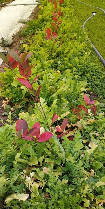 The Aronia bushes are turning red in their holding bed and the contrast of the cover crop of bright green caught my eye.