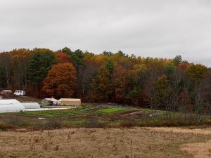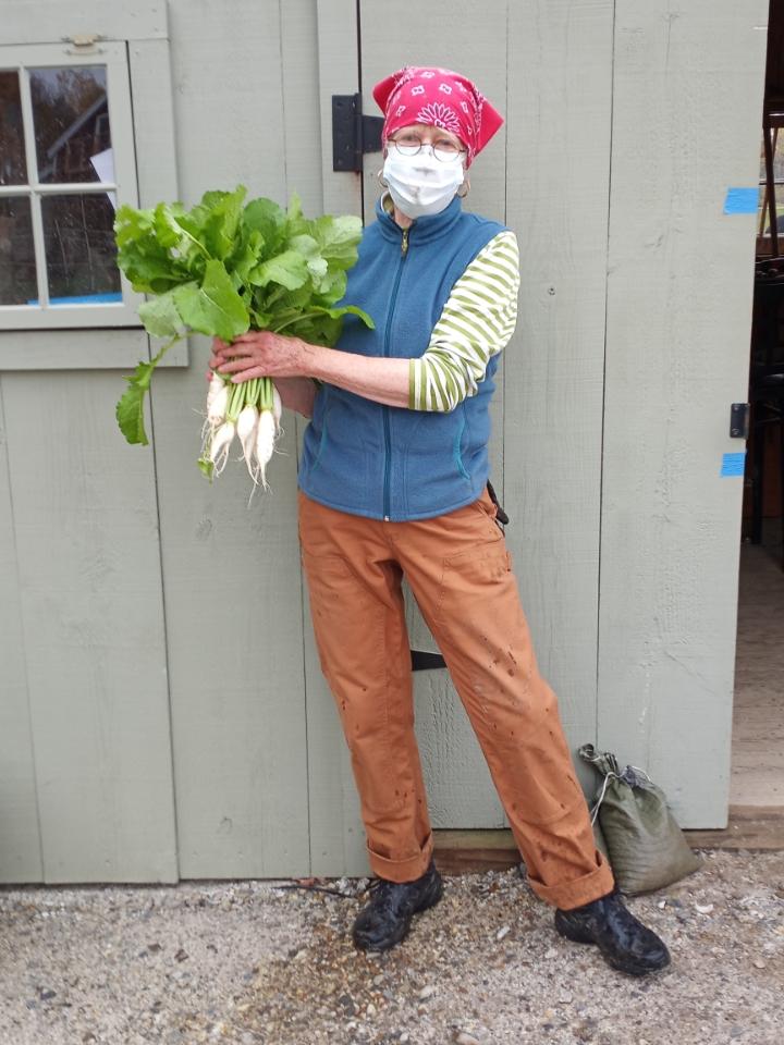 Elizabeth is holding up a bunch of Navet des Vertus Marteau, a French heirloom turnip. They have a harvest date of 35 days and are sweet, while still white. We chose them to finish off as the 3rd planting in one of our tunnels.
