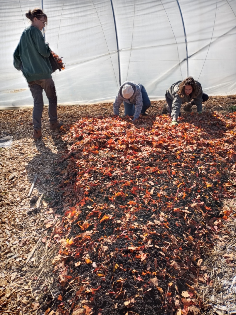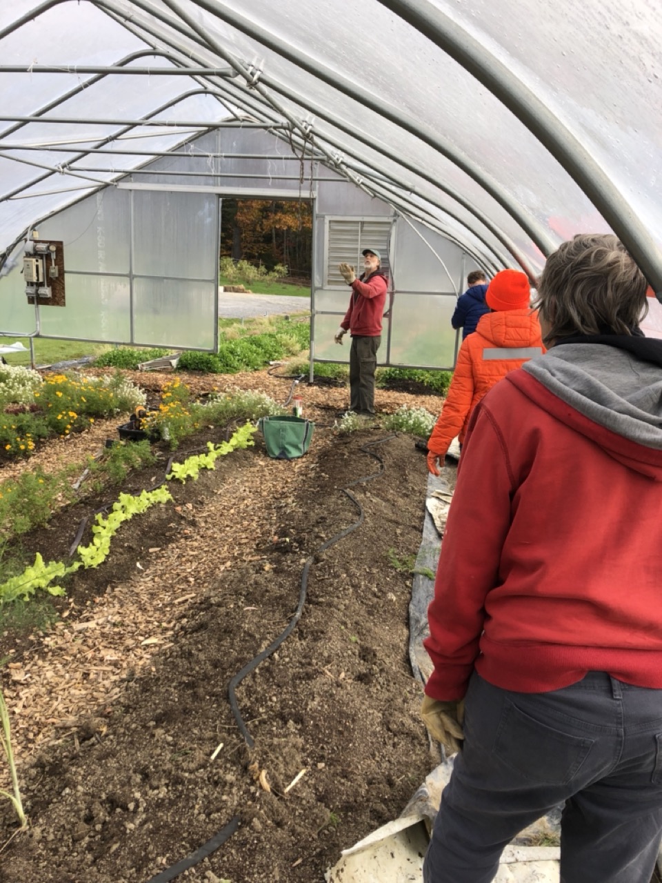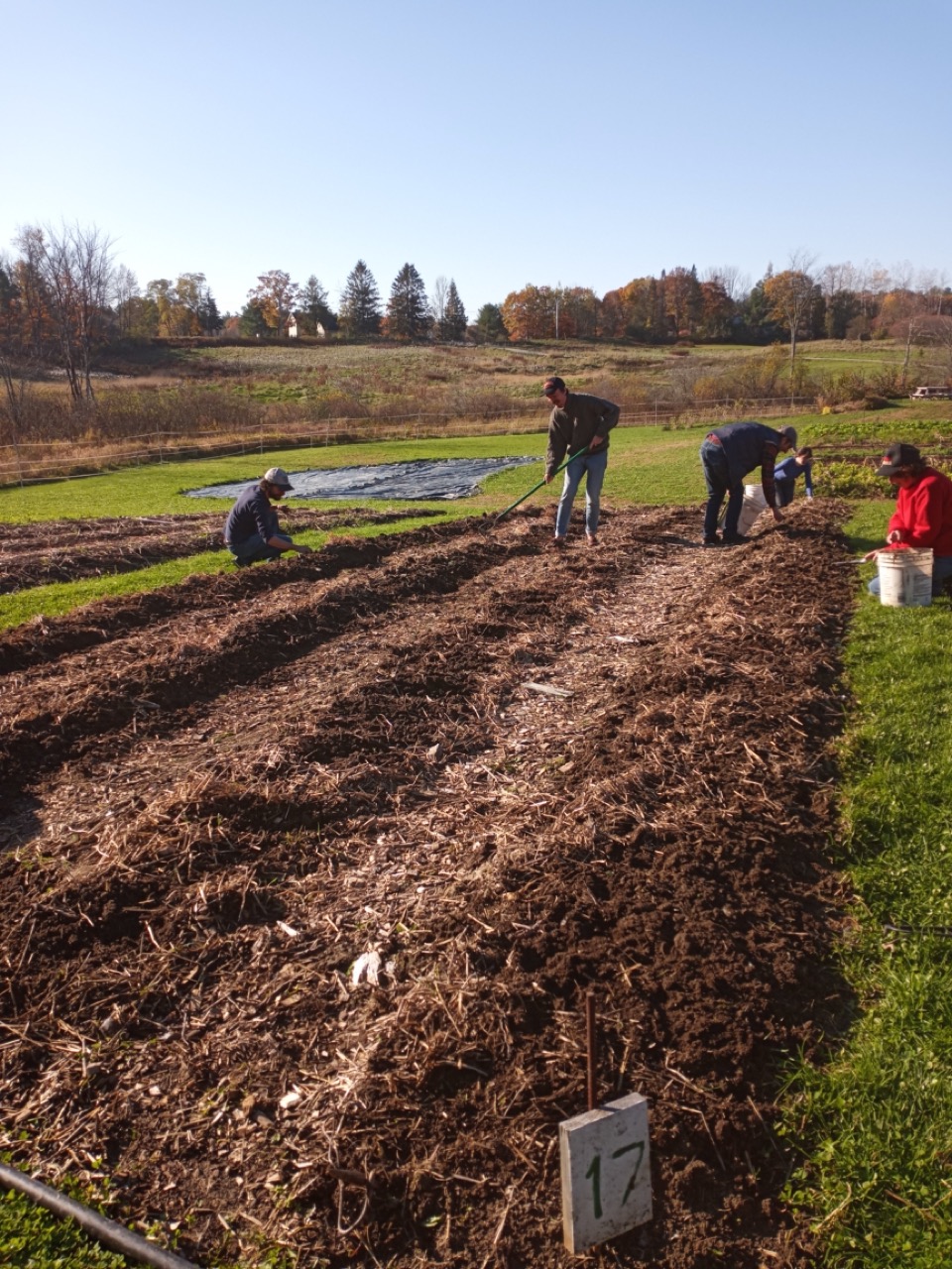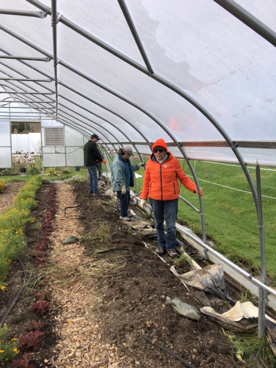Everyone keeps asking me when we will be finished. I thought it would be by the end of this month. Now I am thinking mid-November? We still have veggies to be harvested, tunnels to secure, a few more chips to spread, and …? I really think no one’s ready to say good-bye for a few months. Of course, that is because the weather has been so warm and welcoming it’s been so fun to be outside working. Just wait until our hands are freezing, and we can’t feel our feet! Then we will hug each other and say “see you in the Spring.” For now, we’ll take it one warm fall day at a time.