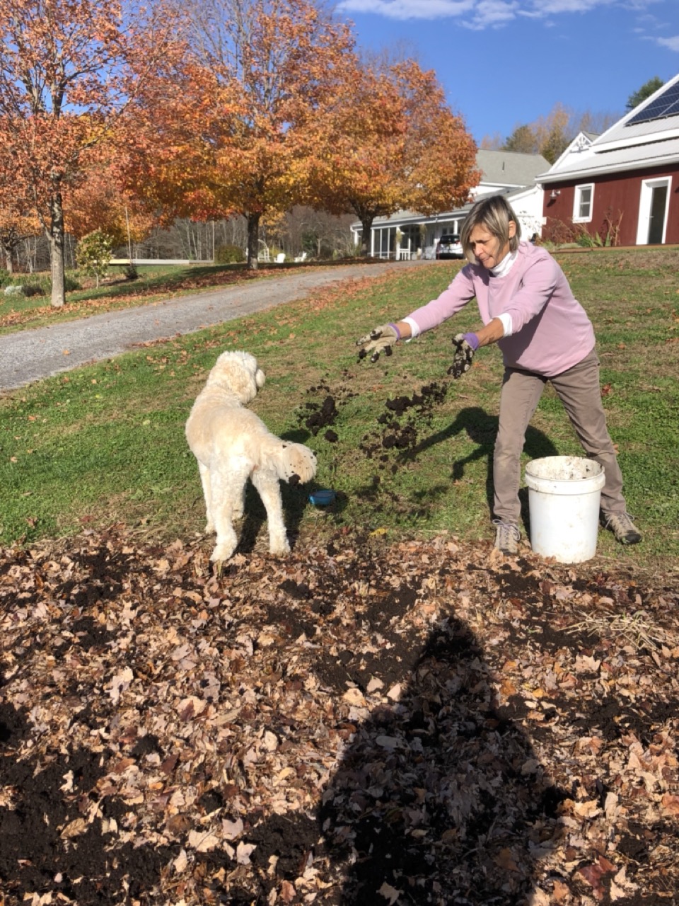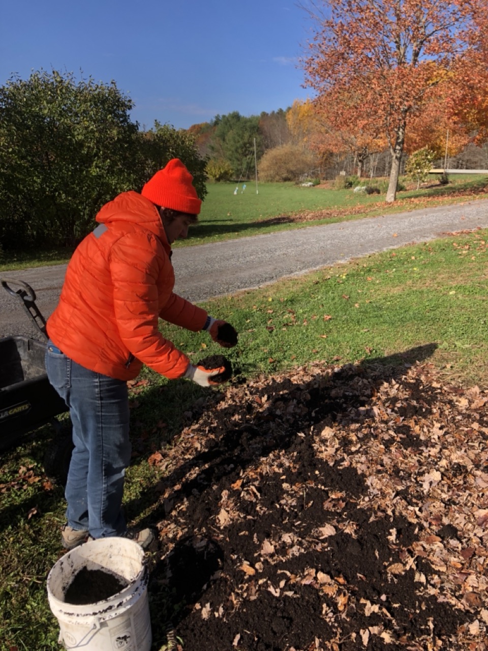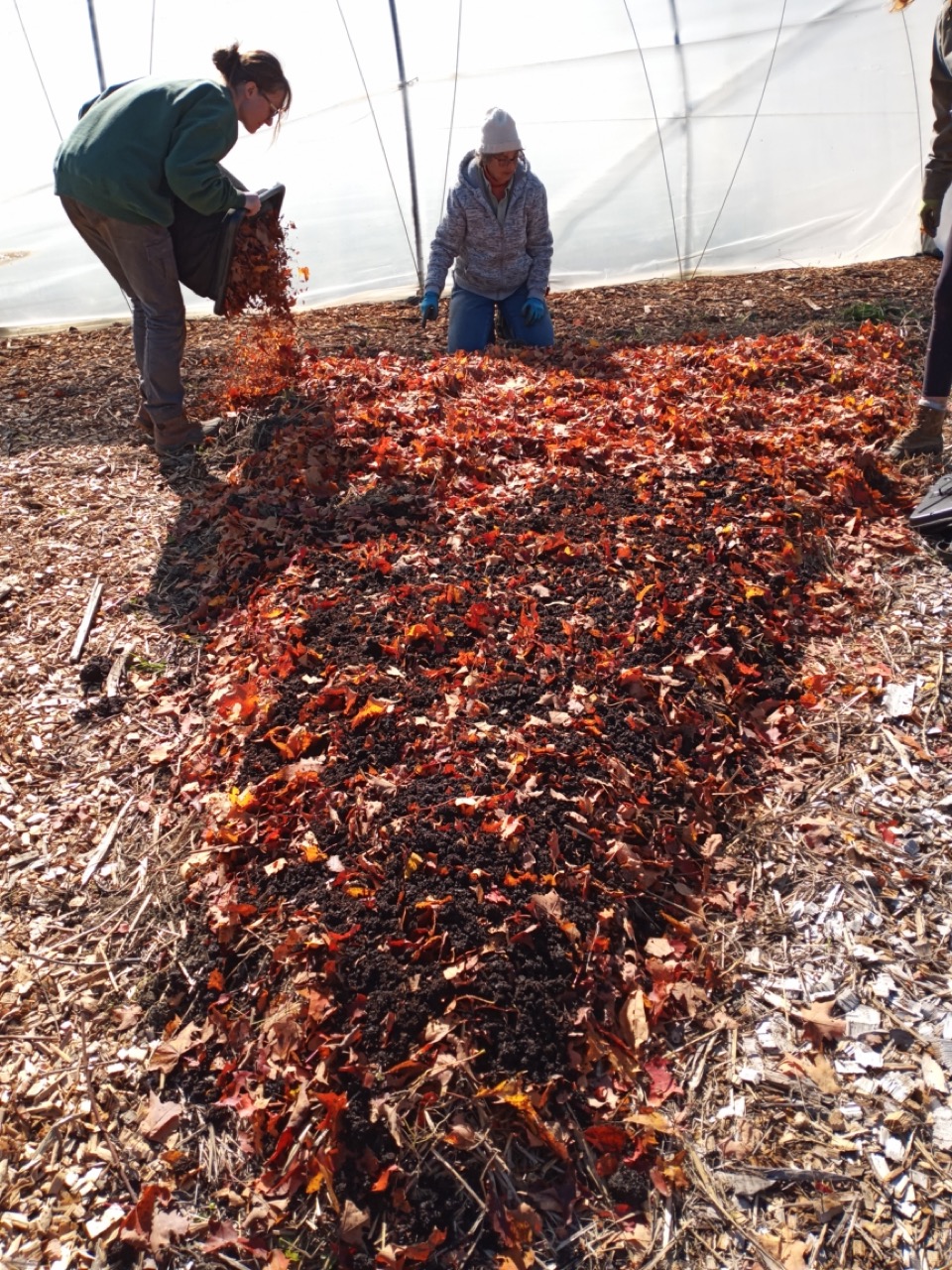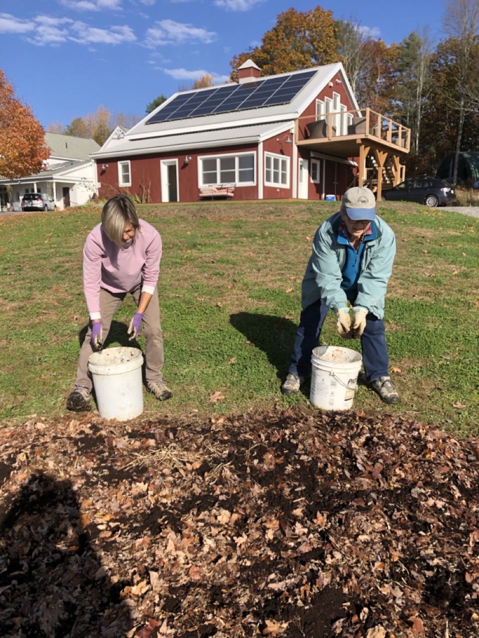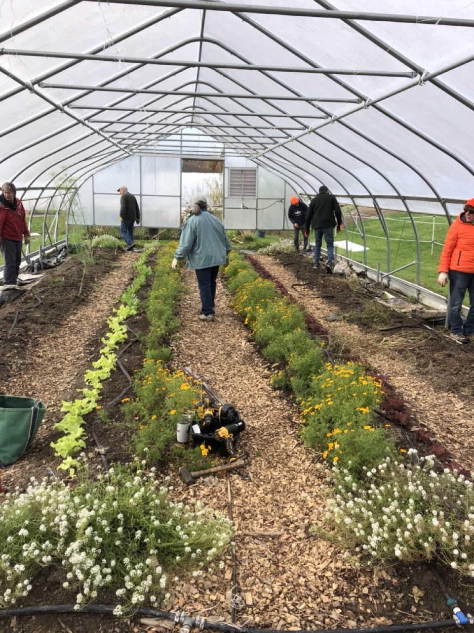 Everyone keeps asking me when we will be finished. I thought it would be by the end of this month. Now I am thinking mid-November? We still have veggies to be harvested, tunnels to secure, a few more chips to spread, and …? I really think no one’s ready to say good-bye for a few months. Of course, that is because the weather has been so warm and welcoming it’s been so fun to be outside working. Just wait until our hands are freezing, and we can’t feel our feet! Then we will hug each other and say “see you in the Spring.” For now, we’ll take it one warm fall day at a time.