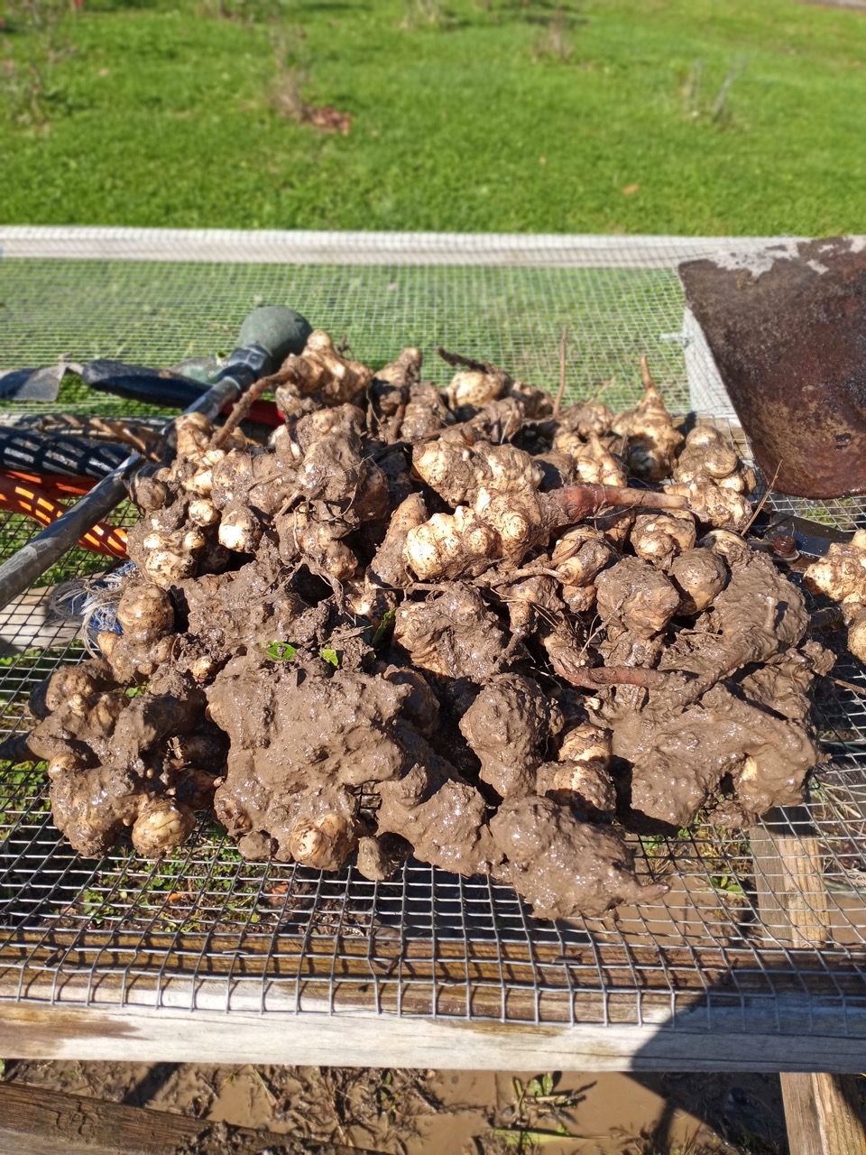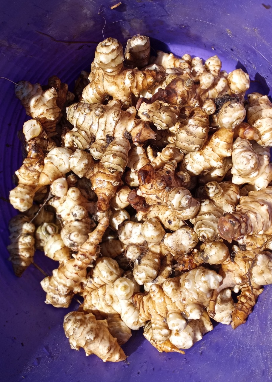 We’ve been cleaning up flower beds and topping with a layer of chopped leaves and a bit of compost to hold them in place. I purposely asked for a bagger attachment for our electric mower so we can generate some of our own mulch. Straw is getting really expensive, so if we can, we stretch it by using chopped leaves. It was another warm, beautiful day to work outside, so we dug up some sunchokes and mulched the beds. Thanks, Wednesday volunteers, for helping dig the sunchokes and “winterize” our 5 triangle flower beds. These sunchokes are a bit hard to clean, but well worth the effort. Roasting seems to be the preferred way to prepare them, bringing out the sweetness in these tubers. These are native to the Americas and are in the sunflower family. If you decide you may want to add some of these vegetables to your own garden, be careful where you plant them. They are VERY prolific and hard to eradicate if desired. Otherwise, enjoy!