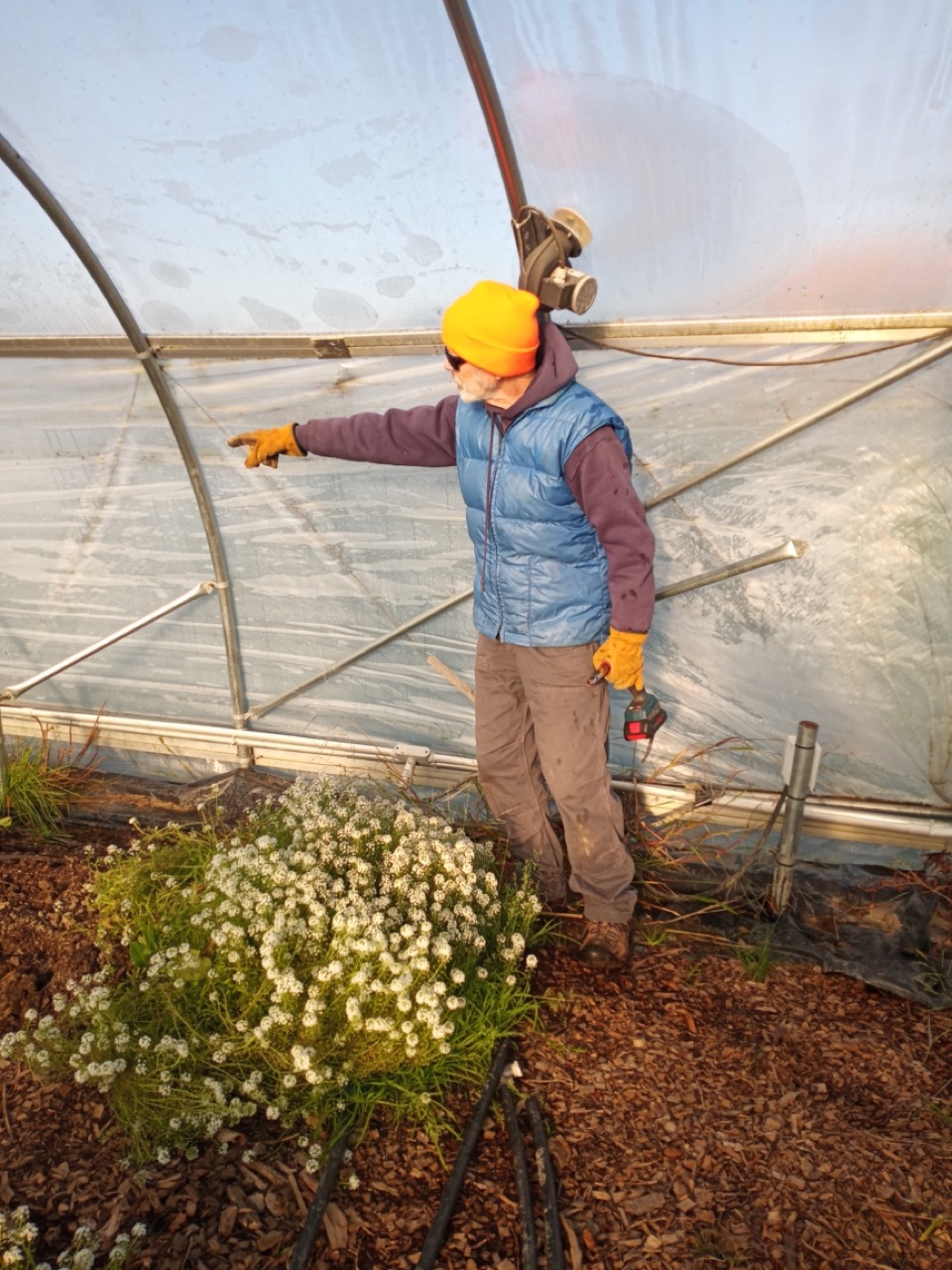 This time of year we get to admire the plants that have been there all along, but were overshadowed by something bigger or brighter. Carrie is admiring this alyssum that has been there at the end of this bed, attracting hoverflies, smelling sweet, and just now really being the star attraction.