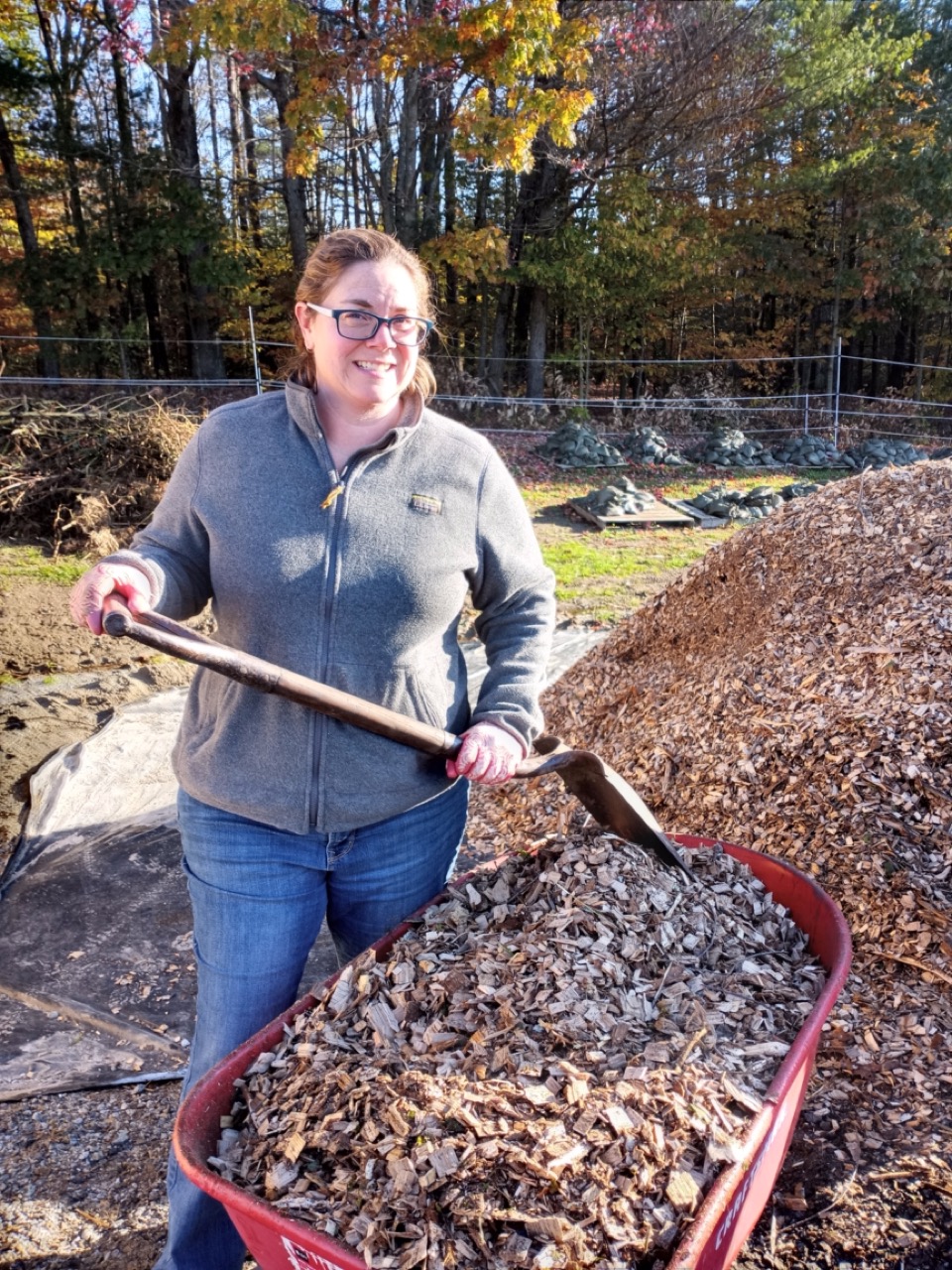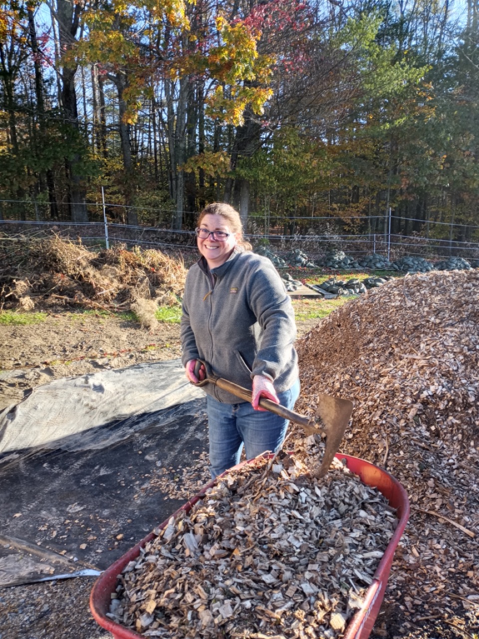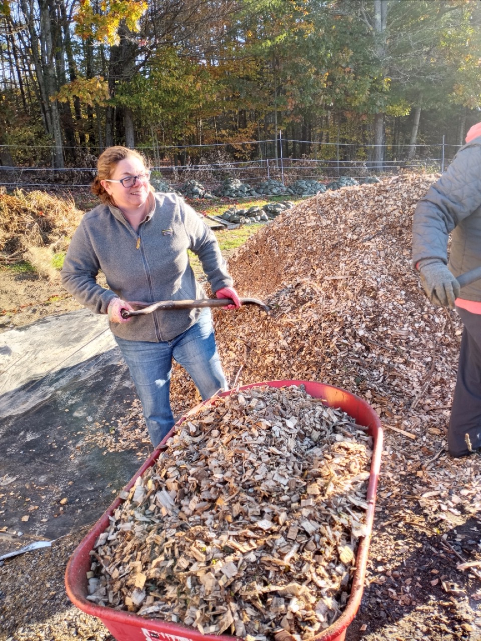 I mention wood chips in probably every farm report. James and Amy Fagan are responsible for us receiving this almost endless supply of chips. These chips enabled us to almost eliminate the use of plastic border strips around our plots and walkways. They keep us out of the mud in the spring, and I think add a natural symmetry around the farm. James is an arborist, and Amy is a long time volunteer and friend of G2G. Thanks to both of you for all your support, and Amy, thanks for allowing me to take your photo. Amy is a good sport when I don’t get the photo I want, and then I say “pretend you are working!” The following are good examples of my photo journalism methods.