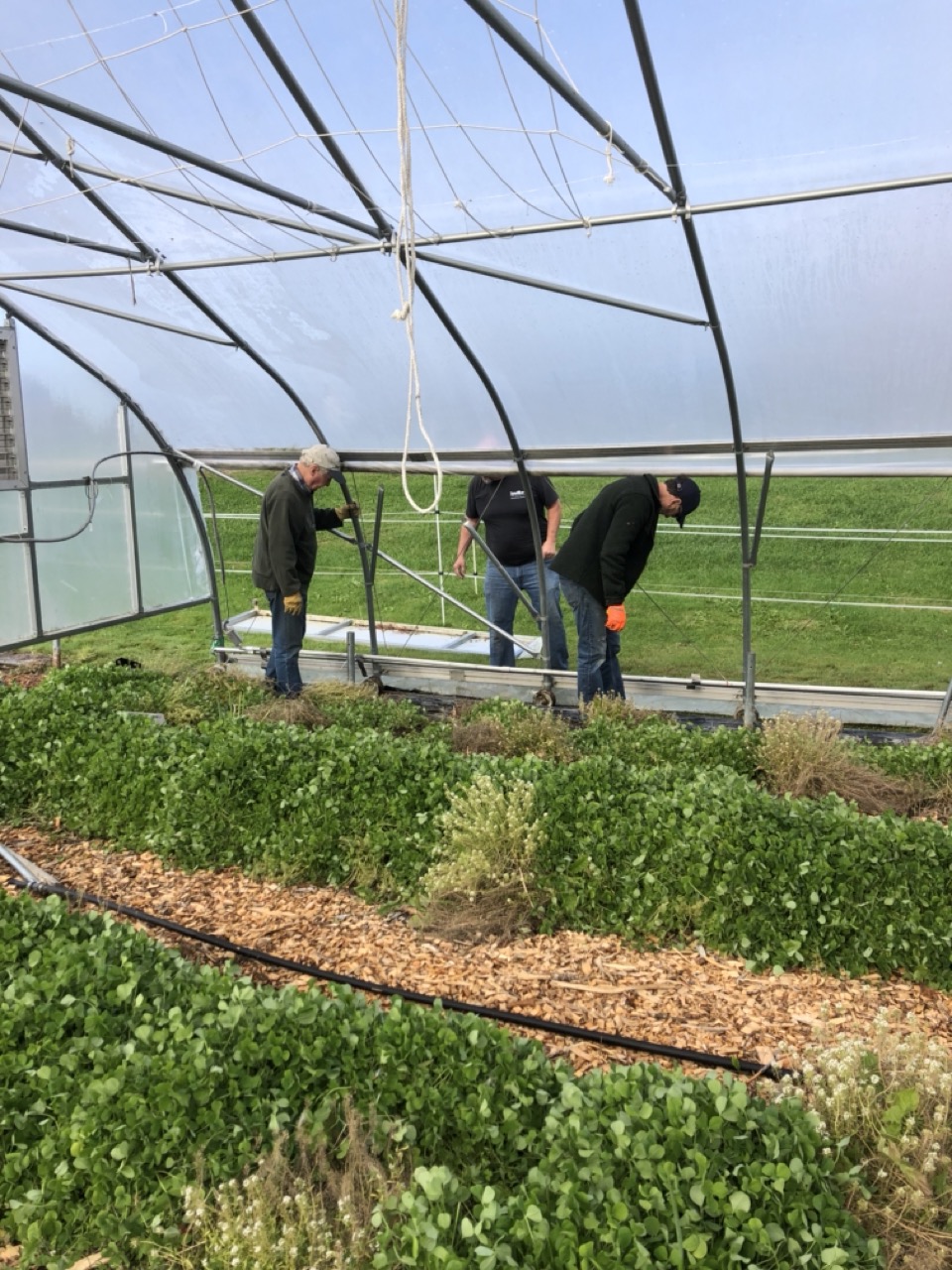 Our neighbor, Burnham, walked over several times this week to help us prepare for the moving of the Rimol greenhouse, which was scheduled to happen on Friday. Thank you, Burnham, for taking the lead on this and getting the word out to the Fix-It Team. I assured everyone it wouldn’t be that hard, and then I left! I had a date with a 4th grader that way surpassed me standing around trying to look helpful. So Carrie, the fixers, and John Newlin–plus the Friday volunteers who paused their work mulching the driveway gardens to come help push (watch a video of the action here!)–got the job done and by the time I got back everyone was gone, and the Rimol stood in its new location. Impressive. Thanks, Cathy, for setting up the coffee break station.