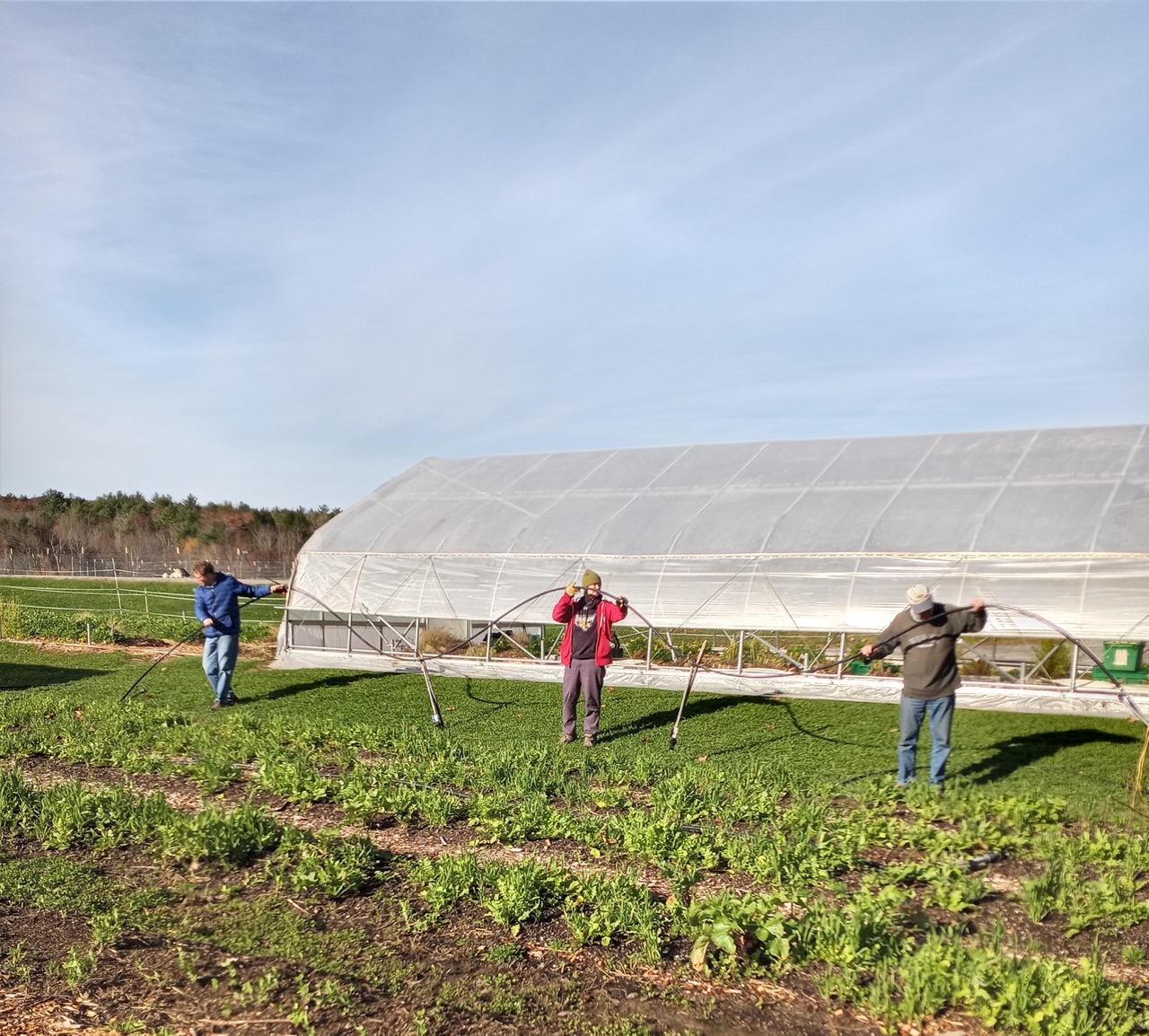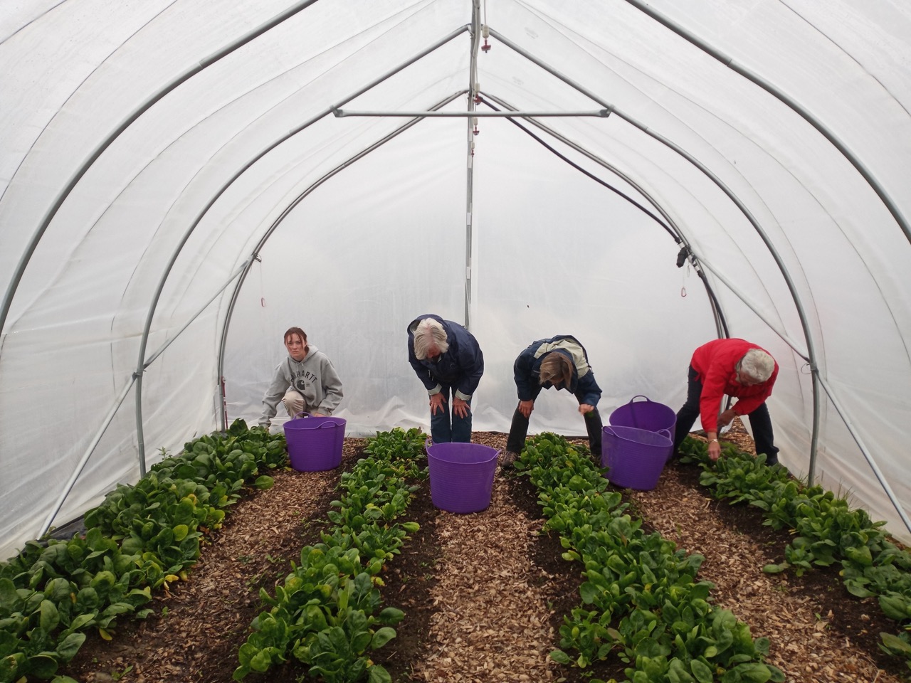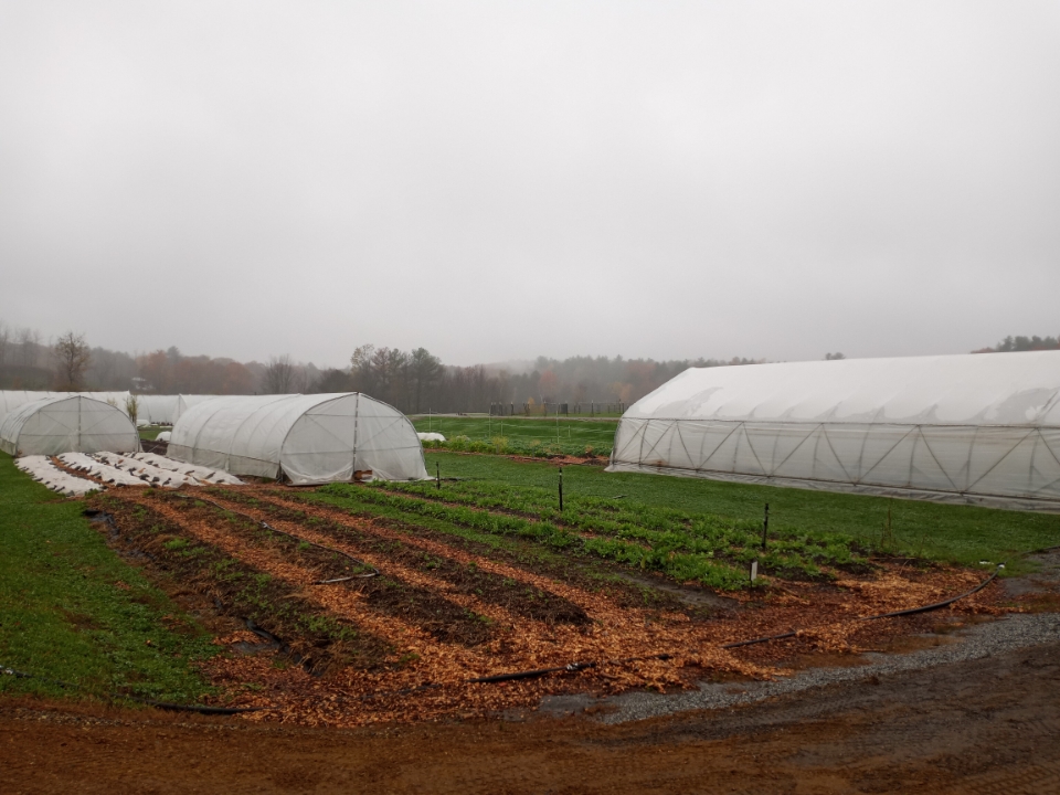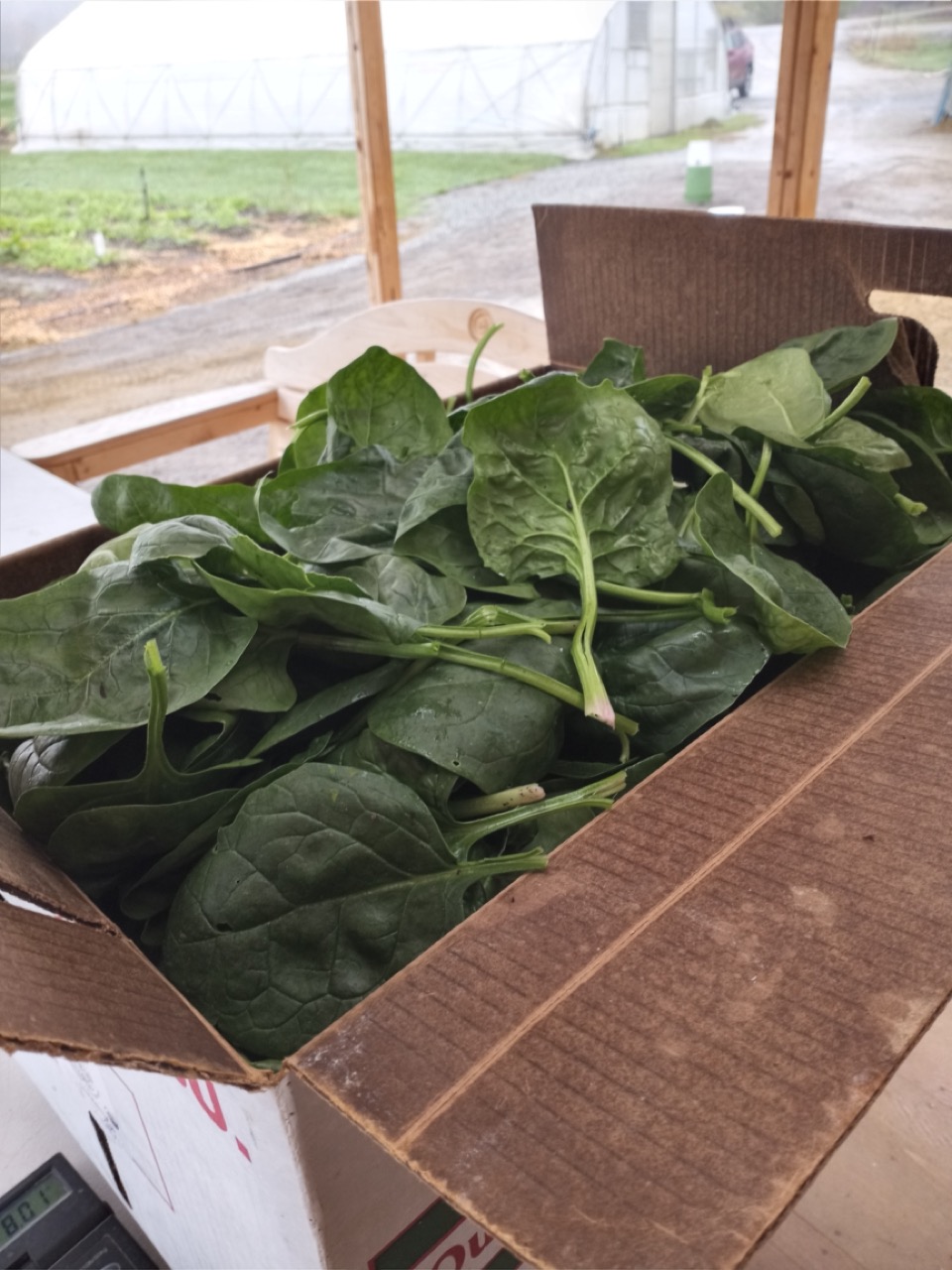 It was cool and rainy outside on Monday, but warm and dry in the spinach tunnel. It took 5 of us about an hour to pick five cases of fresh spinach. These were large boxes full to the brim and weighing in at a total of 16.23 pounds. That’s 259 spinach salads at 1oz each. Here’s what one ounce of spinach looks like plated up. We are so happy to be able to harvest all this spinach in this last week of October. It looks like we will be able to keep harvesting from this tunnel for a few more consecutive weeks. This is why we have all these tunnels–being able to send fresh food to our recipients late in the season when fresh local greens become scarce.
