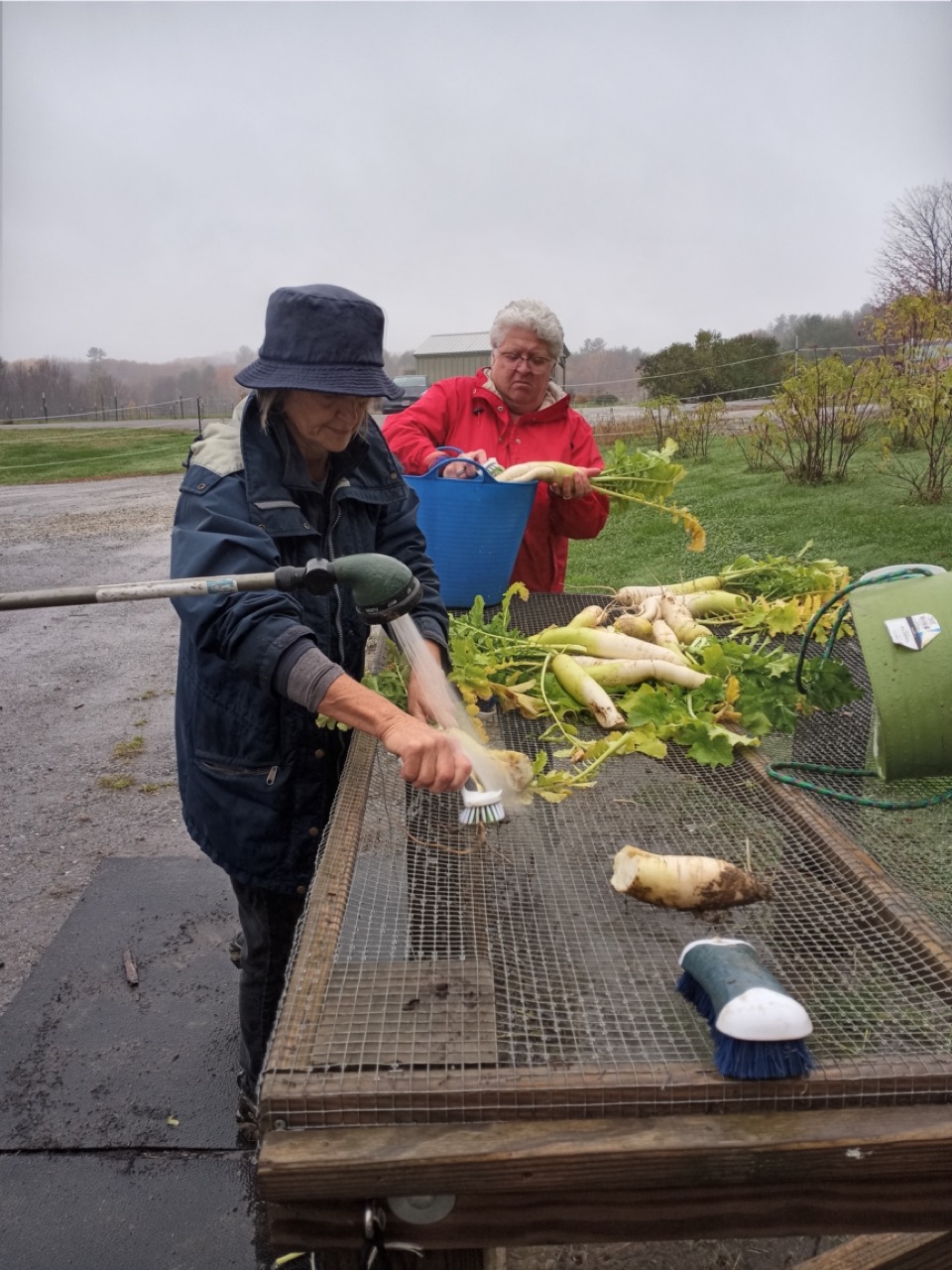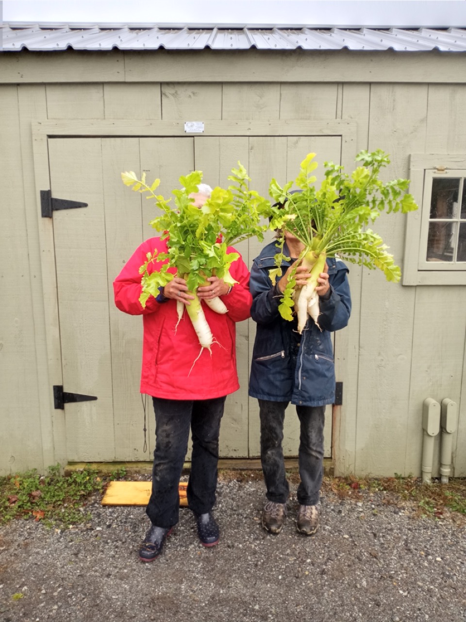 Also on Monday morning, it took three of us five minutes to harvest and clean eight daikon radishes weighing in at 17.86 pounds. These are growing in our cover crop mix and are grown especially to break up some of the hardpan clay at the base of our newest fields–a yummy side product in our cover crops. They are delicious roasted (treat as you would a carrot) with a mixture of other root vegetables or eaten raw in salads. The leafy greens can be eaten, too! Enjoy them sauteed with a typical Japanese flavor profile of sweet and savory or simply sauteed with garlic in olive oil and seasoned with red chili pepper flakes. As fun as it is to hunt for those long radishes weighing in at almost 2.25 pounds each, the 259 spinach salads seems much more gratifying to send off with the gleaners.