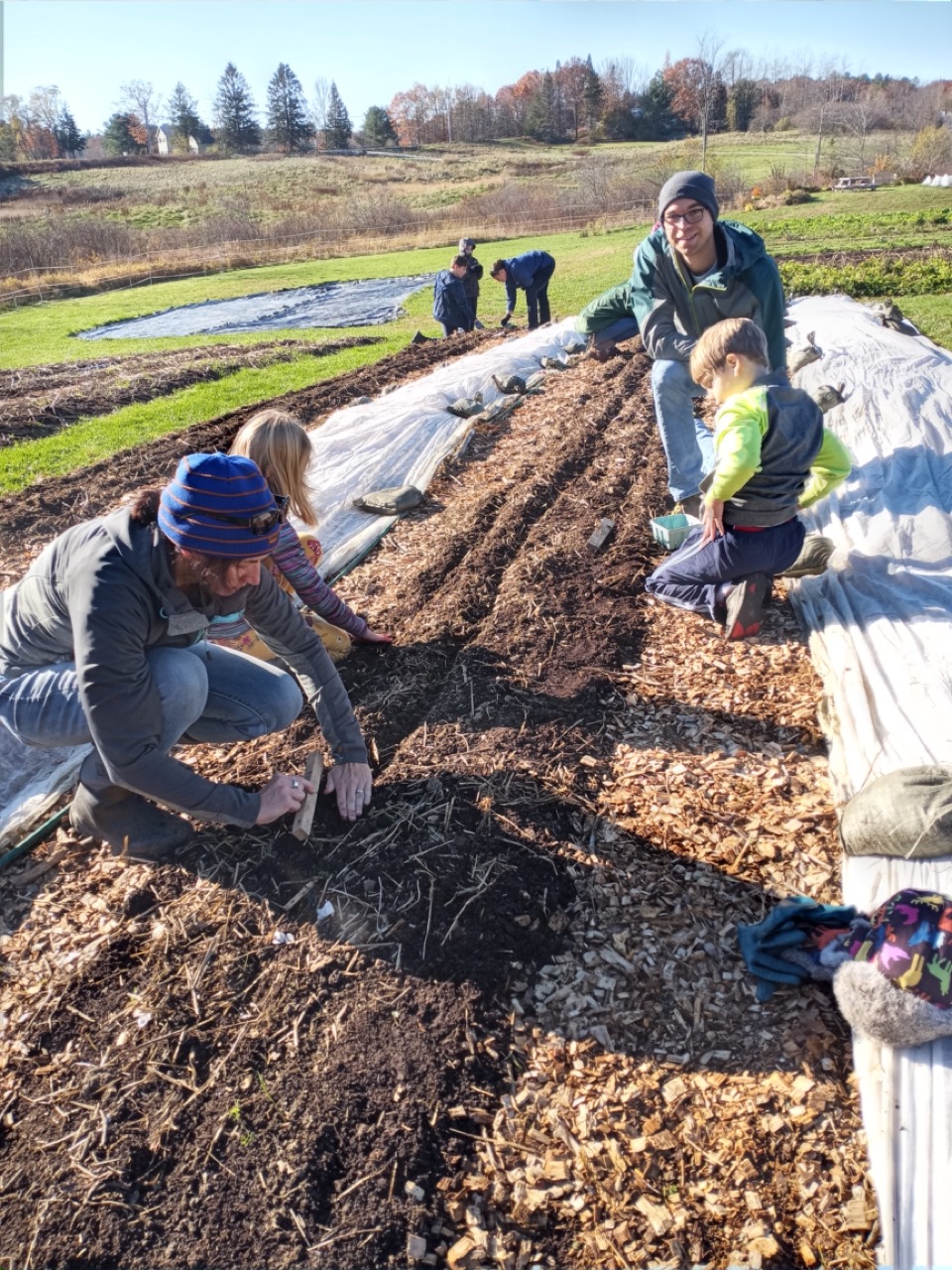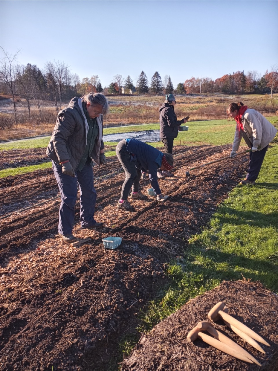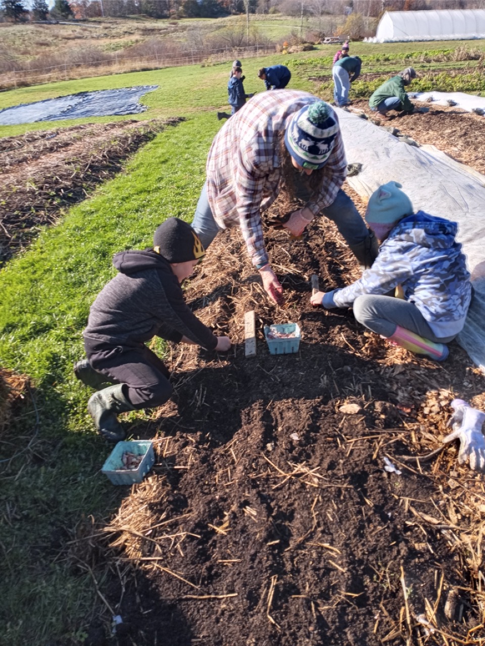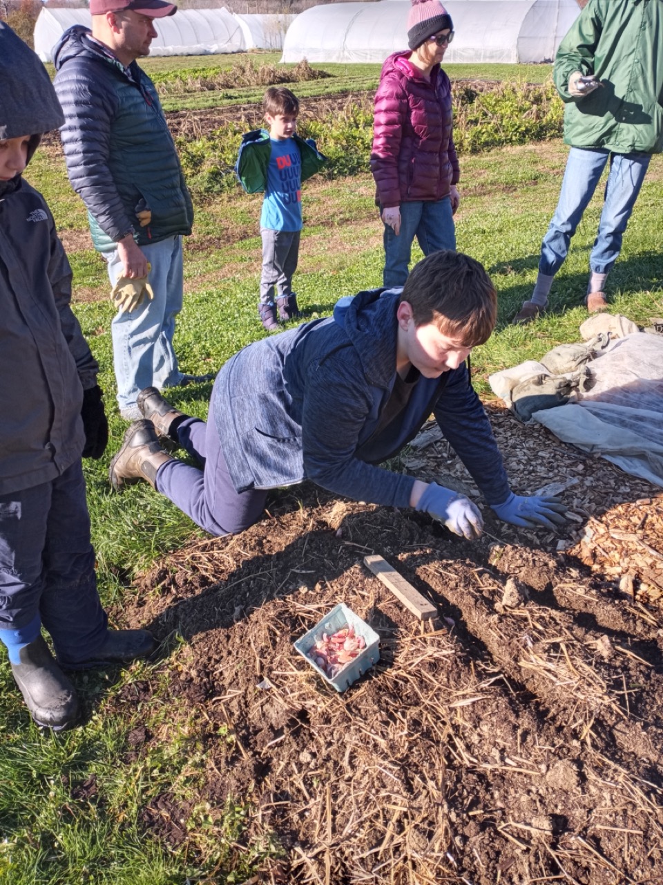 We had a scheduled visit for Saturday morning with Amy Ford, Faith Formation Coordinator, and a group of families from All Saints Parish in Brunswick. There were 7 children in the group, so we saved planting garlic for them. Carrie and I have been reading about garlic, and this year we decided to add nitrogen to our beds as we prepared them for the planting. I won’t go into the details of adding nitrogen at this time of year, just the fact that what we are looking to accomplish is having it still be available in the spring when the ground thaws and the plants start to grow. Saturday morning the temperature was 29 degrees at 8:00AM, but sunny and no wind! I asked the Saturday volunteers to get ready for the kids and mark the lines for planting garlic. They had to work with a bit of frost on the surface, but picking up tools and moving around began to warm us up. Genevieve started gathering everything we would need for our group, and the Saturday crew went ahead and planted two out of the four 50-foot beds. Three rows across, 6” apart–that’s 1,200 cloves of garlic we needed to plant. The 8AM team got started, and the 9AMers arrived in time to help finish up planting, top the beds with a light layer of chopped leaves, straw, and row cover to hold it all in place. Time to do your thing, garlic!