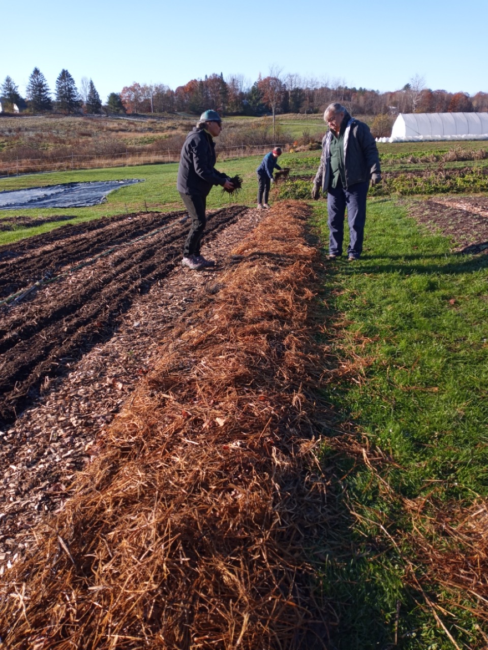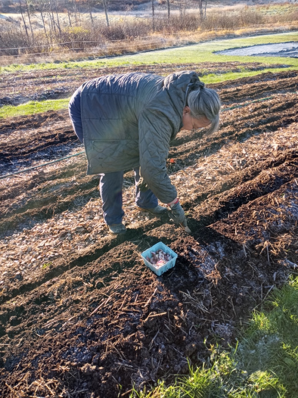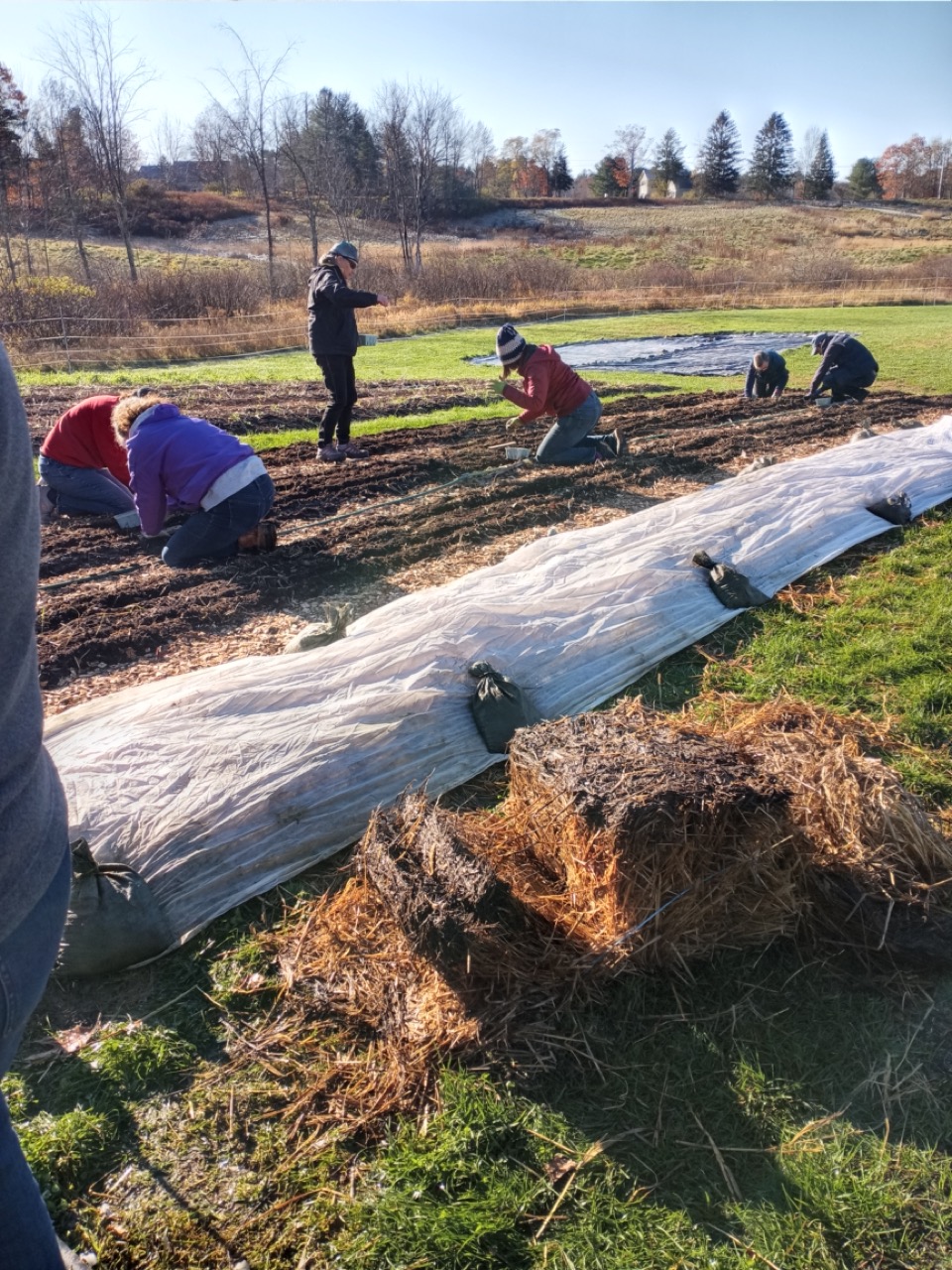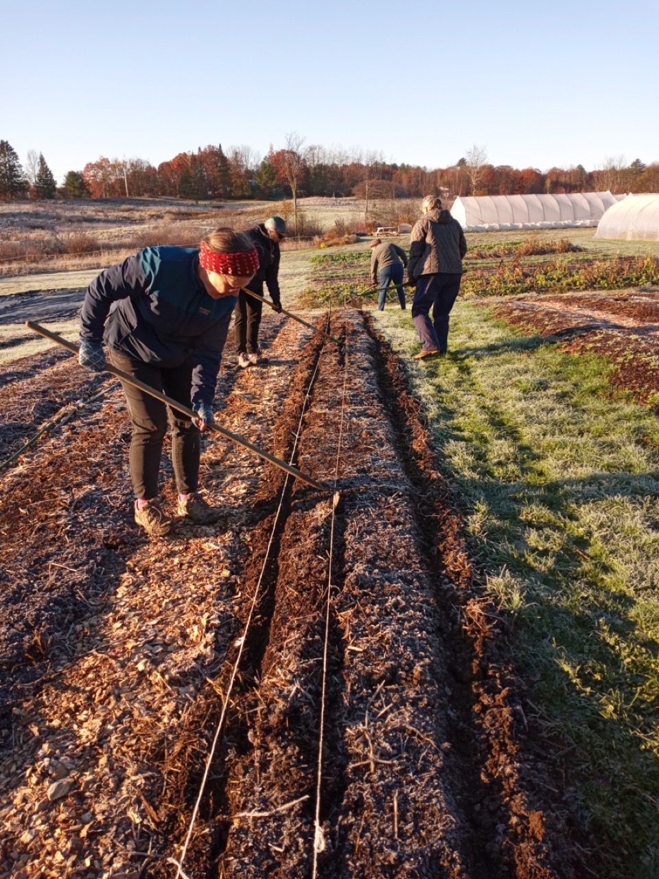 We had a scheduled visit for Saturday morning with Amy Ford, Faith Formation Coordinator, and a group of families from All Saints Parish in Brunswick. There were 7 children in the group, so we saved planting garlic for them. Carrie and I have been reading about garlic, and this year we decided to add nitrogen to our beds as we prepared them for the planting. I won’t go into the details of adding nitrogen at this time of year, just the fact that what we are looking to accomplish is having it still be available in the spring when the ground thaws and the plants start to grow. Saturday morning the temperature was 29 degrees at 8:00AM, but sunny and no wind! I asked the Saturday volunteers to get ready for the kids and mark the lines for planting garlic. They had to work with a bit of frost on the surface, but picking up tools and moving around began to warm us up. Genevieve started gathering everything we would need for our group, and the Saturday crew went ahead and planted two out of the four 50-foot beds. Three rows across, 6” apart–that’s 1,200 cloves of garlic we needed to plant. The 8AM team got started, and the 9AMers arrived in time to help finish up planting, top the beds with a light layer of chopped leaves, straw, and row cover to hold it all in place. Time to do your thing, garlic!