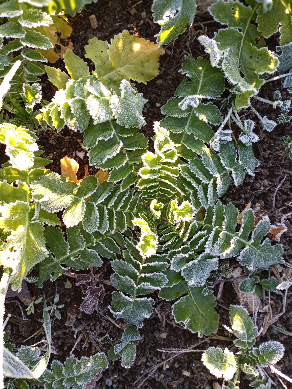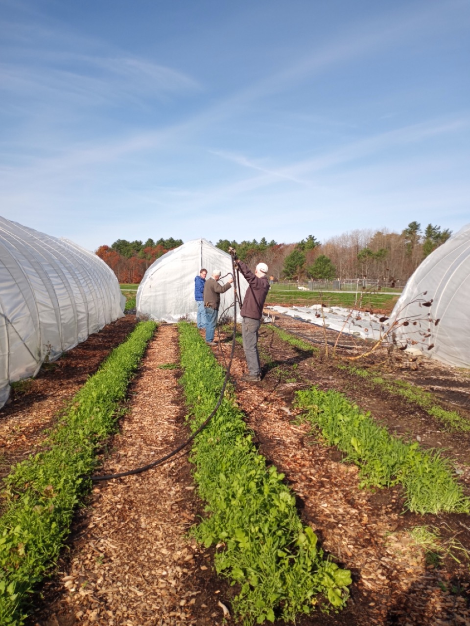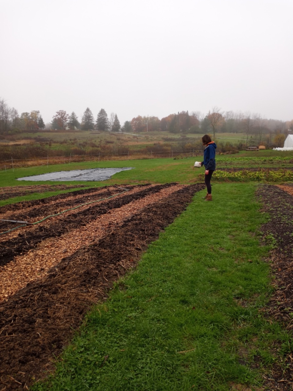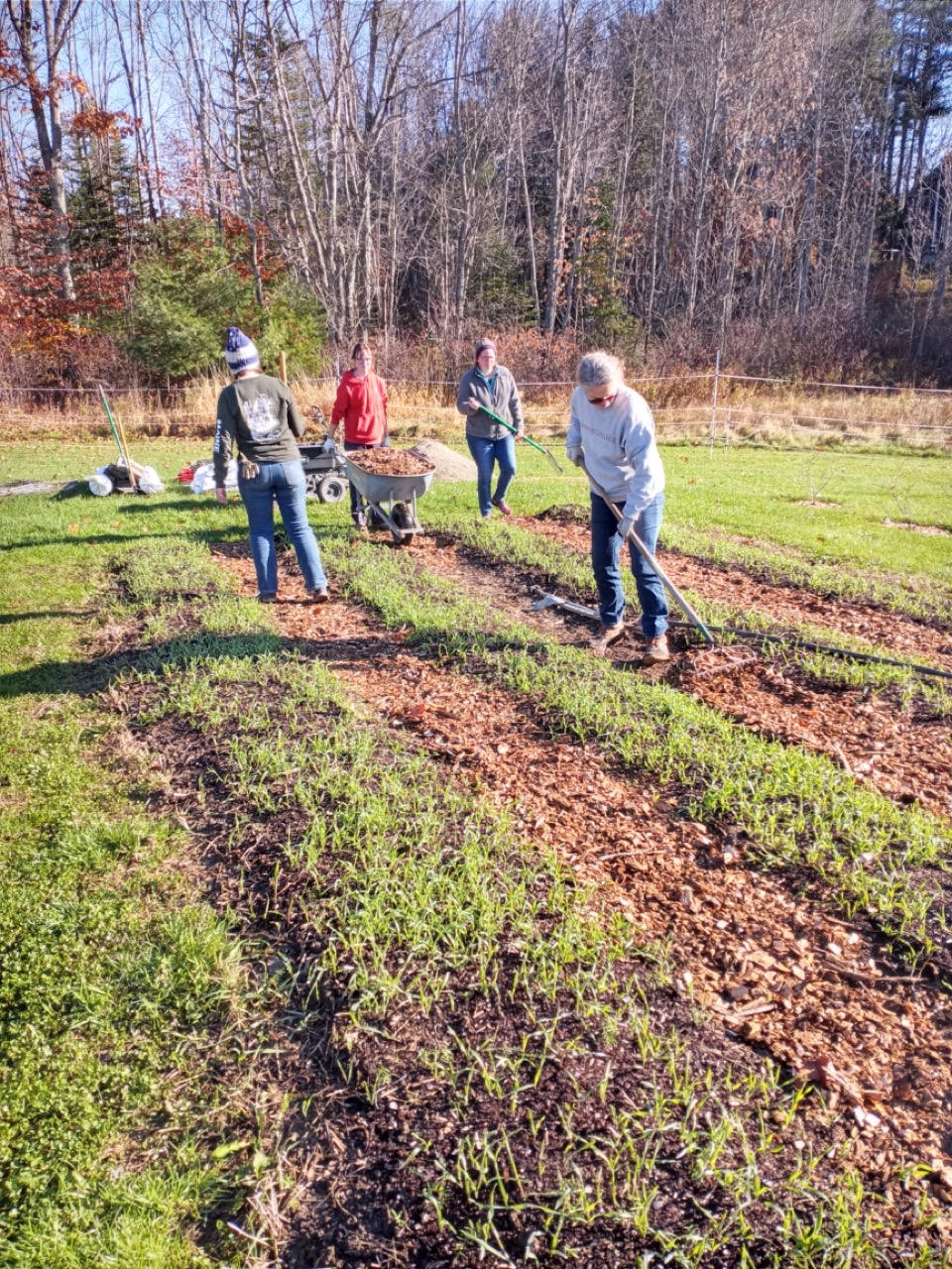 We had a scheduled visit for Saturday morning with Amy Ford, Faith Formation Coordinator, and a group of families from All Saints Parish in Brunswick. There were 7 children in the group, so we saved planting garlic for them. Carrie and I have been reading about garlic, and this year we decided to add nitrogen to our beds as we prepared them for the planting. I won’t go into the details of adding nitrogen at this time of year, just the fact that what we are looking to accomplish is having it still be available in the spring when the ground thaws and the plants start to grow. Saturday morning the temperature was 29 degrees at 8:00AM, but sunny and no wind! I asked the Saturday volunteers to get ready for the kids and mark the lines for planting garlic. They had to work with a bit of frost on the surface, but picking up tools and moving around began to warm us up. Genevieve started gathering everything we would need for our group, and the Saturday crew went ahead and planted two out of the four 50-foot beds. Three rows across, 6” apart–that’s 1,200 cloves of garlic we needed to plant. The 8AM team got started, and the 9AMers arrived in time to help finish up planting, top the beds with a light layer of chopped leaves, straw, and row cover to hold it all in place. Time to do your thing, garlic!