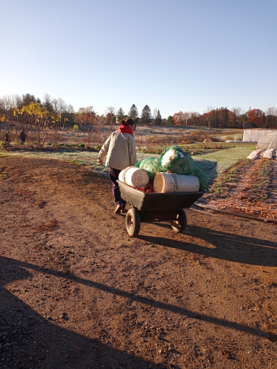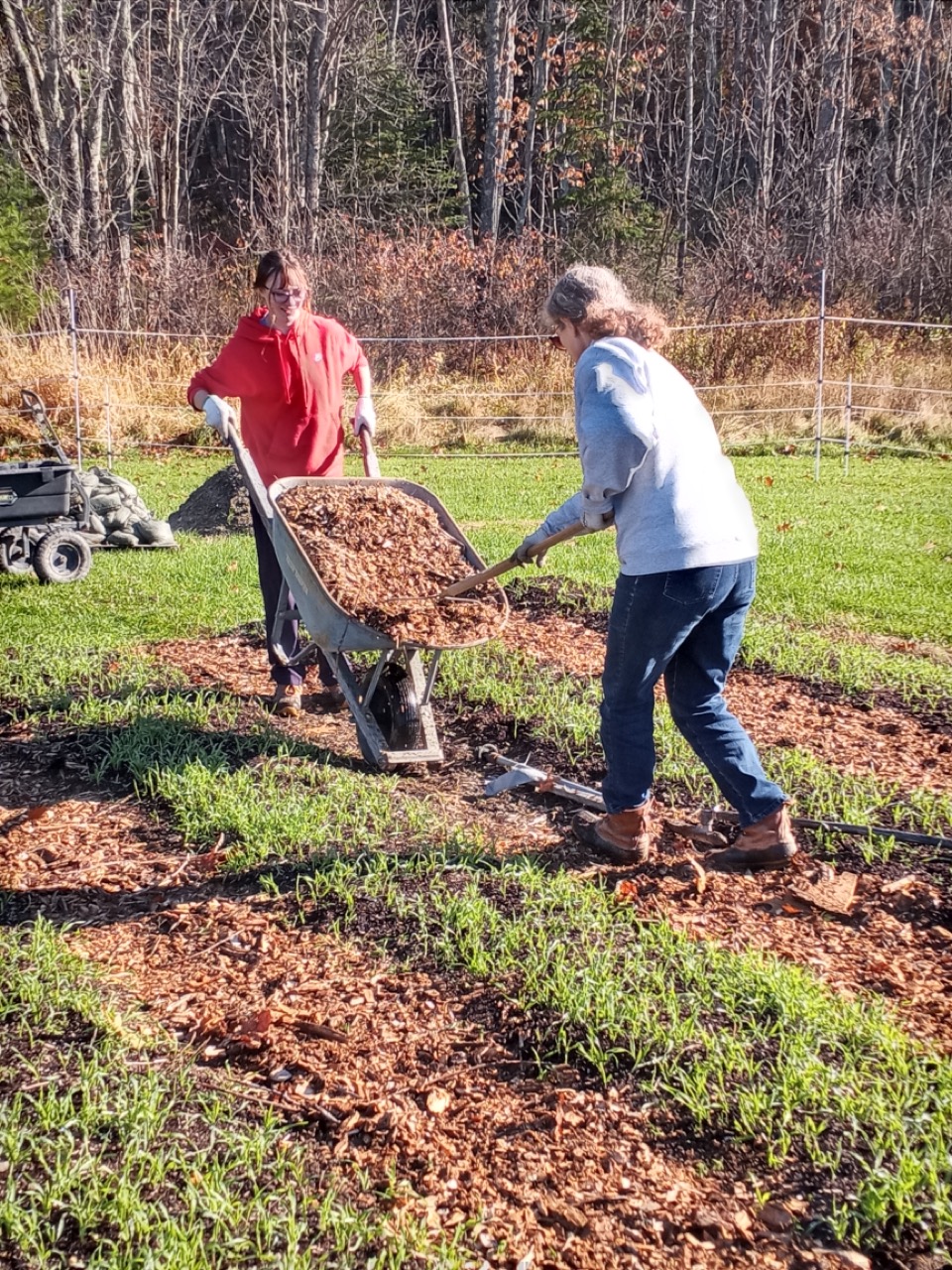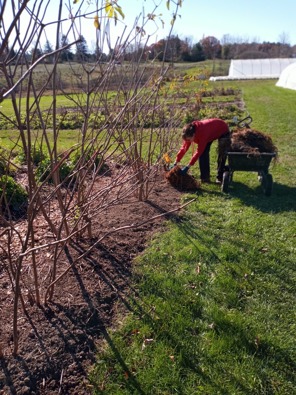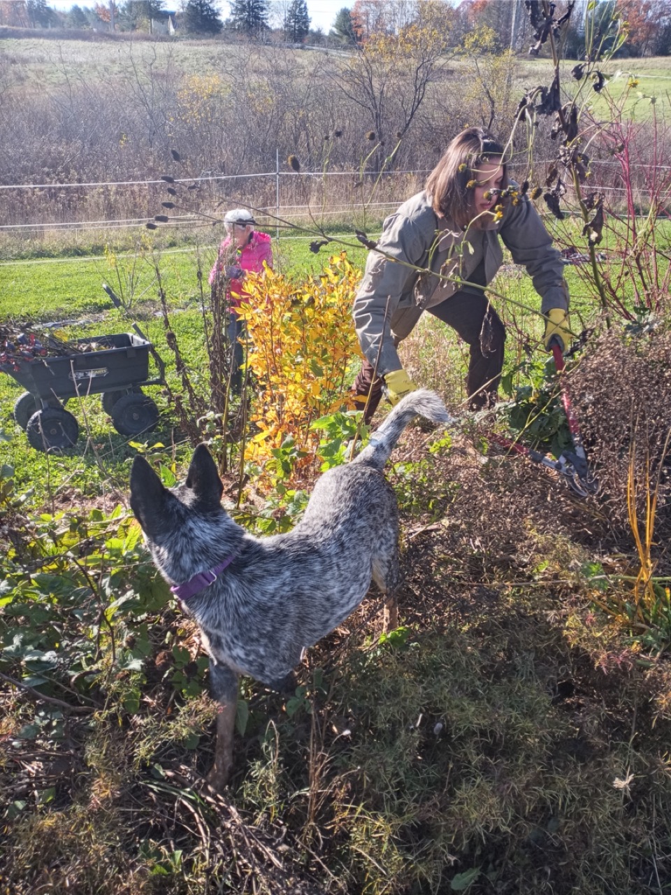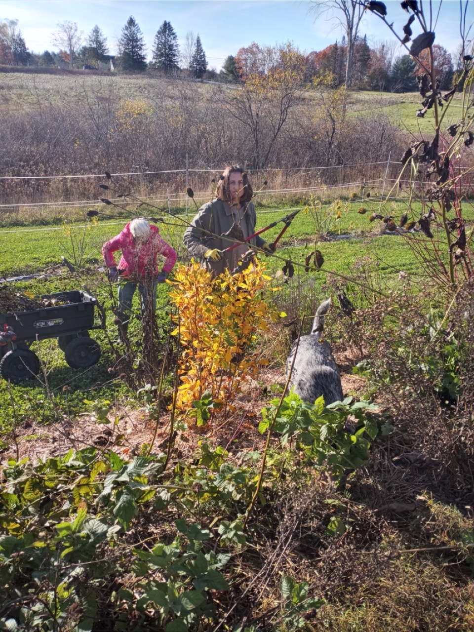 The weather is about 10 degrees above normal and continues into next week. We are finishing up so many little projects that are putting us ahead for next spring–pruning and weeding the hedgerows, looking for voles (Zoey’s job), and weeding and mulching elderberries. We will just keep tweaking those last minute chores into next week. There’s still some harvesting going on, and there’s always wood chips.