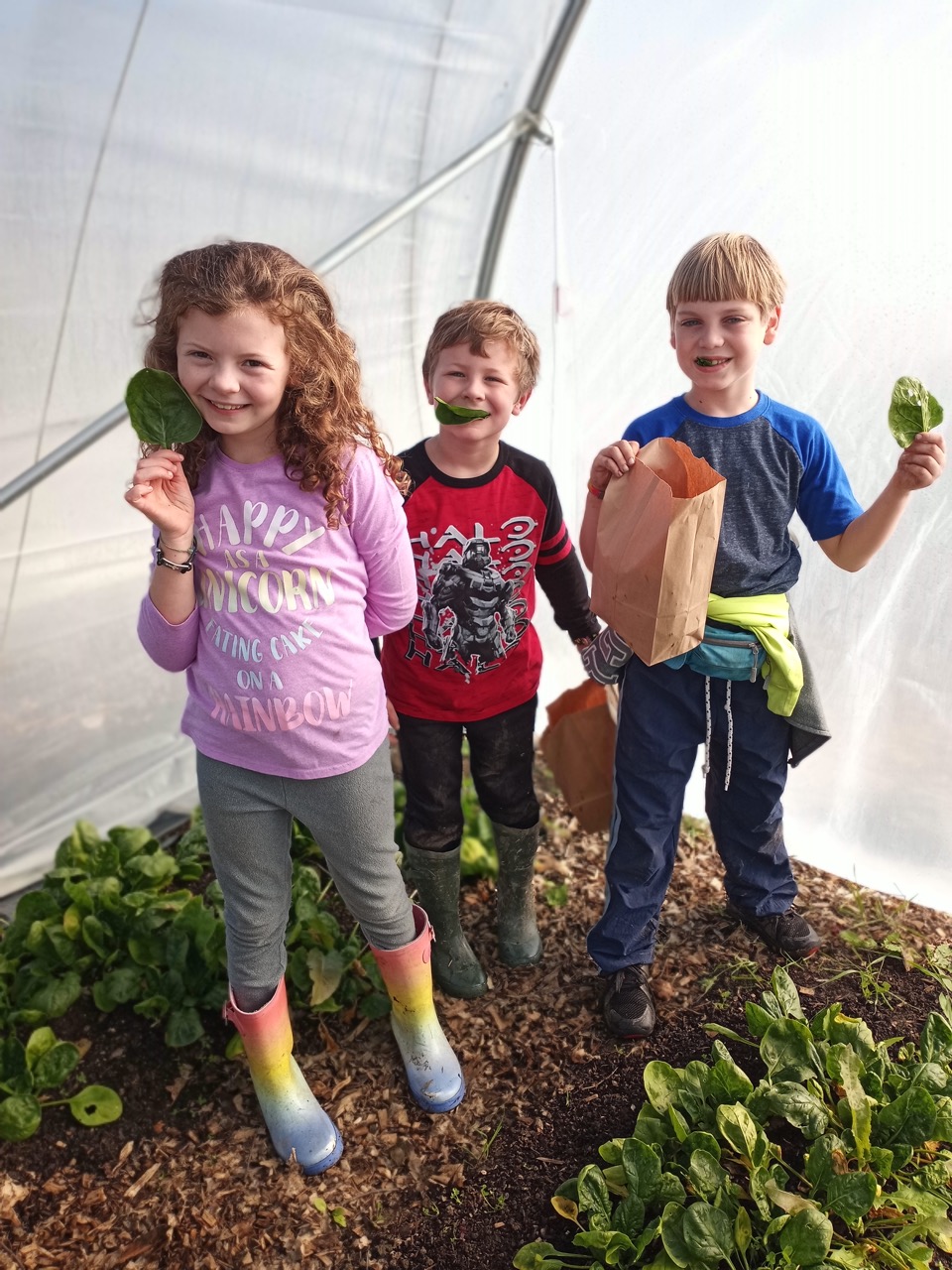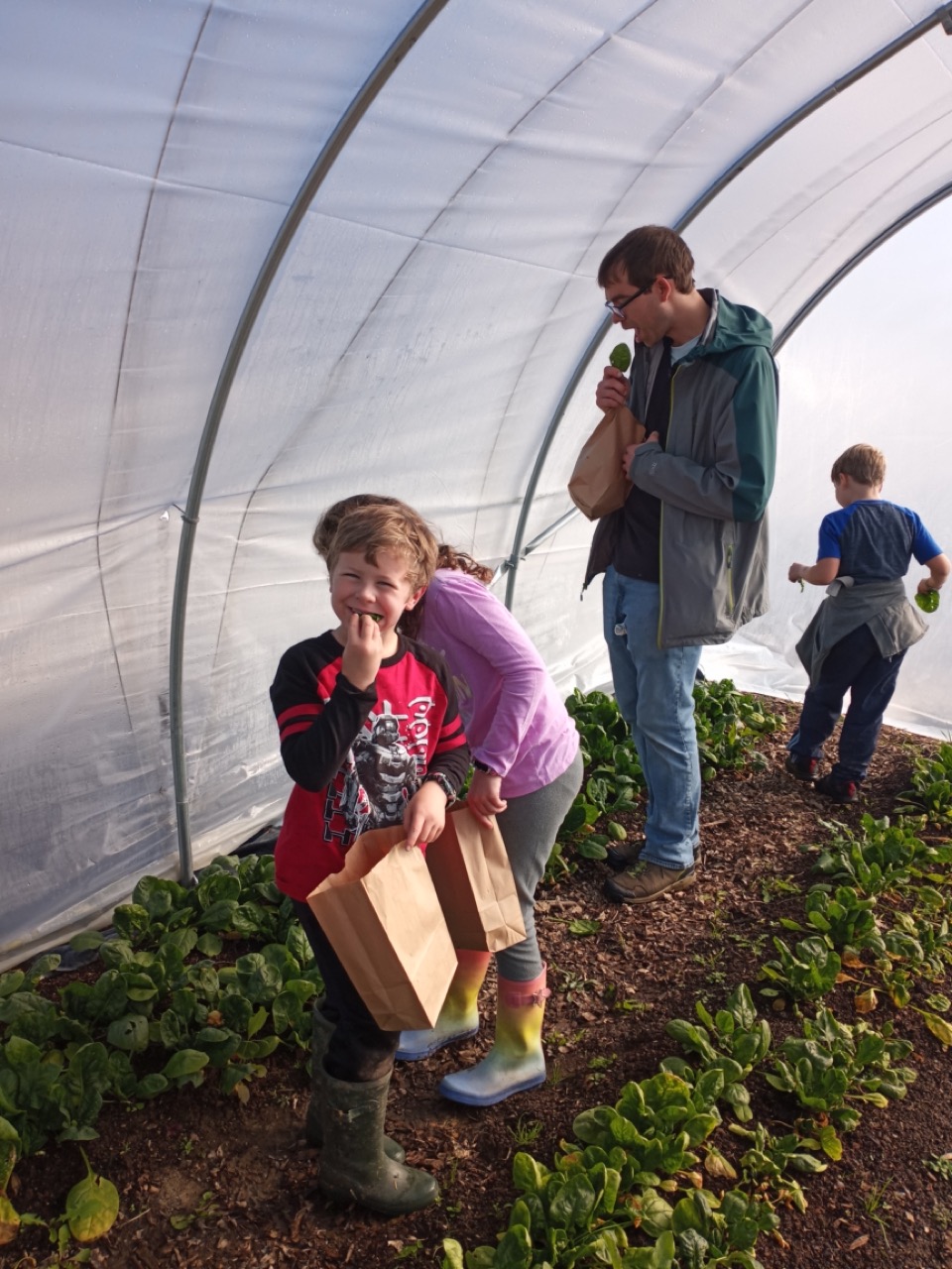The families arrived, I explained our project, gave a quick demo, and promised goat time upon completion. The garlic got planted in record time, so we went to pick some cabbage leaves to feed the goats. I told the group there was something I wanted to show them first. I took them over to see Wendi’s spinach tunnel because anything that prolific and bright green this time of year amazes everyone. I invited them to pick a spinach leaf and taste how sweet it is. Rarely do we have anyone say, “no thanks”, but one little boy told me he didn’t like spinach. I told him this was a very different kind of spinach–very sweet, and if he didn’t like it, he could spit it out. I saw him take a tiny bite, and then we headed over to the goats. I heard his mom ask “where is your spinach leaf?” He had a sweet smile and said “I ate it–it was good!”