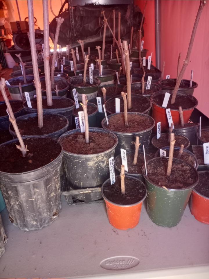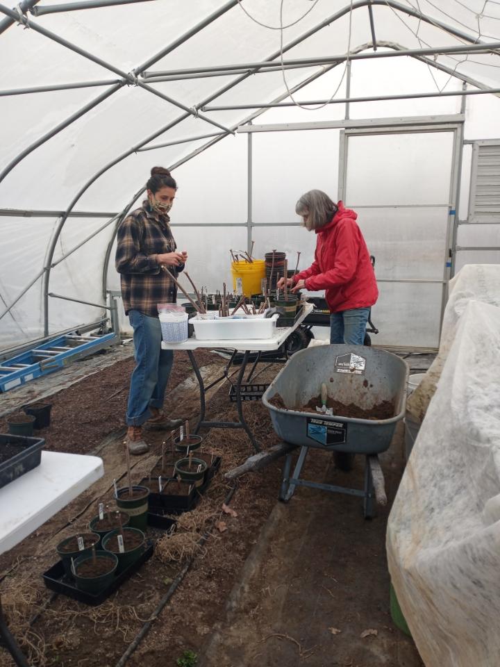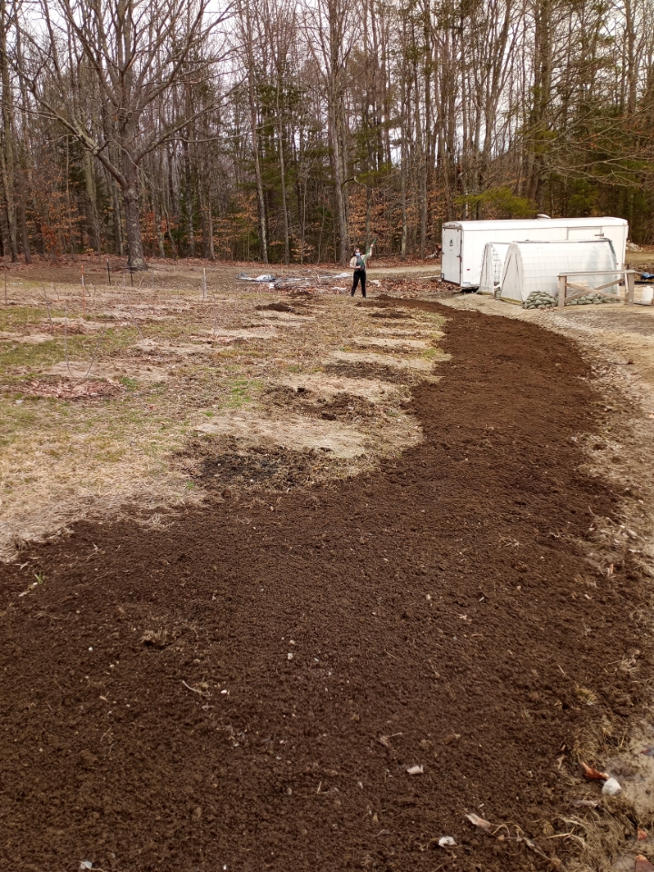 In our continuing promotion of all things elderberry; we planted directly into a weed suppressant tarp that was laid last fall. With the help of Carrie’s parents, a hammer, and a piece of rebar (the ground was still a bit frozen), a hole was created. Compost and biochar were added and the slip planted. It’s an experiment, will keep you posted. Continuing with elderberries, all the rest of our pruned slips went into pots with half topsoil, half compost. They are now in the dark while we wait for roots to develop. We must have close to 100 of these slips potted up. We hope to have them available for our plant sale on Saturday, May 22.