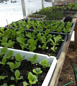 Now we need the rain to give us a break so we can get back to planting. Lots of beautiful Chinese cabbage and lettuce seedlings eager to get their roots in the soil. This week we are on to starting flower seeds, herbs, tomatoes, and peppers. As these starting trays are filled with new seeds, larger cool weather plants are hardened off and transitioned to the greenhouses.