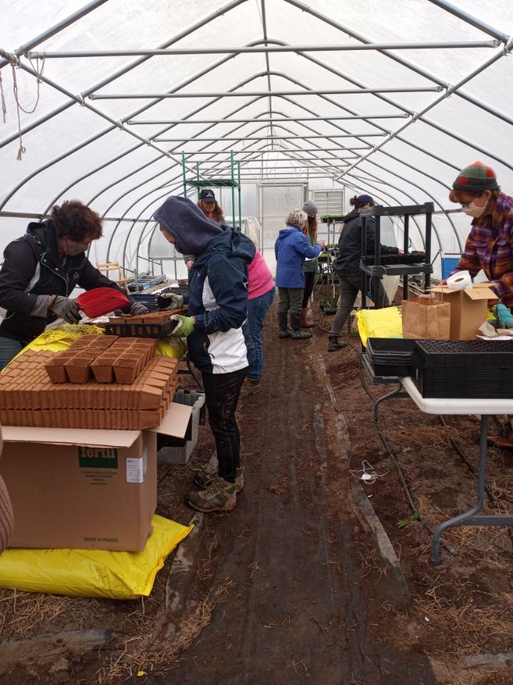 The lovely weekend weather had no ill effects on our field plantings. I was excited we got all that moisture that will help germinate the spring cover crop. The cold and snow just caused the Saturday team to work inside. The greenhouse was busy with everyone planting seeds and transplanting seedlings. We have over 150 trays of seedlings planted. Most are for the farm but some will be for our upcoming seedling sale in May, the 20, 21, and 22. It will be an online sale like last year. This year you will be able to shop with your pre-order instead of curbside pick up.