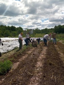 Carrie led a group of volunteers from Apogee on Thursday. They enthusiastically blew through our to-do list and moved on to help us with weeding (weeding is never off our list). A few also learned how to basket weave tomatoes. They will be back to volunteer later this summer. Thank you, Apogee team!