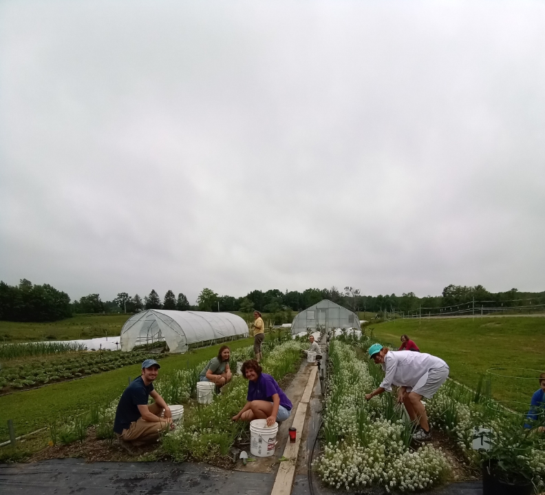 Carrie led a group of volunteers from Apogee on Thursday. They enthusiastically blew through our to-do list and moved on to help us with weeding (weeding is never off our list). A few also learned how to basket weave tomatoes. They will be back to volunteer later this summer. Thank you, Apogee team!