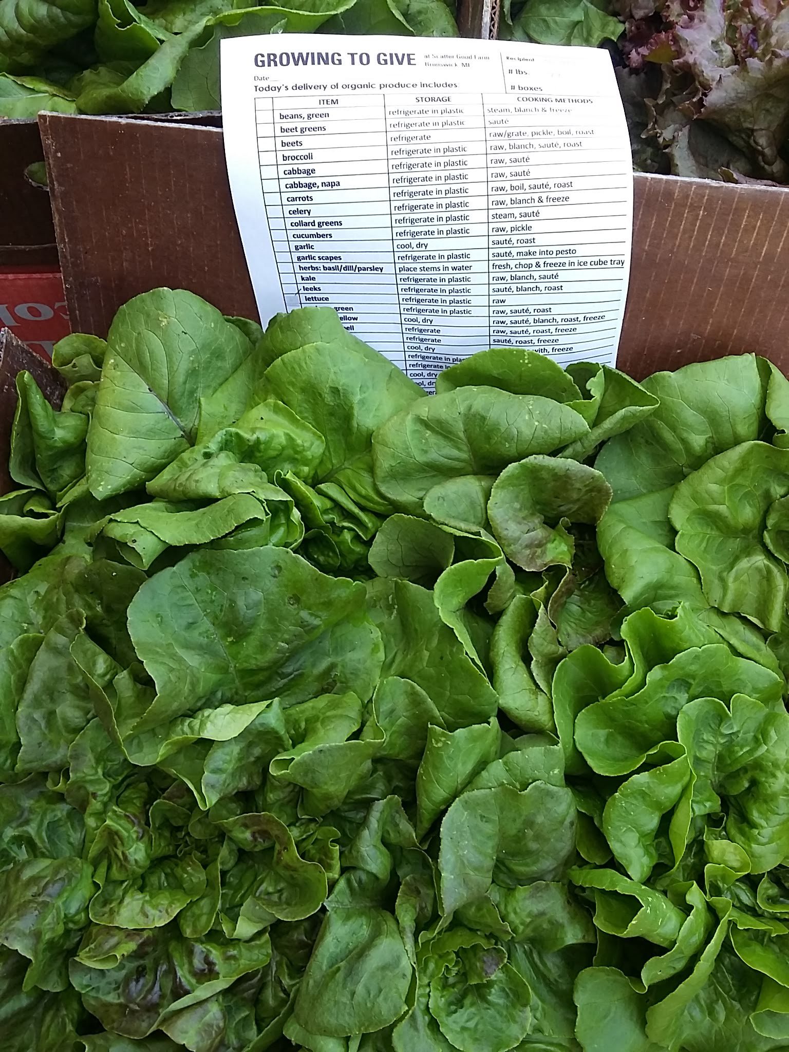 Multiple gleanings this week resulted in 300 pounds of lettuce being sent out to our local food system. Boxes and individual bags for distribution are accompanied by a Growing to Give identification list. We came up with a checklist that explains what produce is being delivered and a simple explanation of how to store and use it.