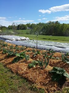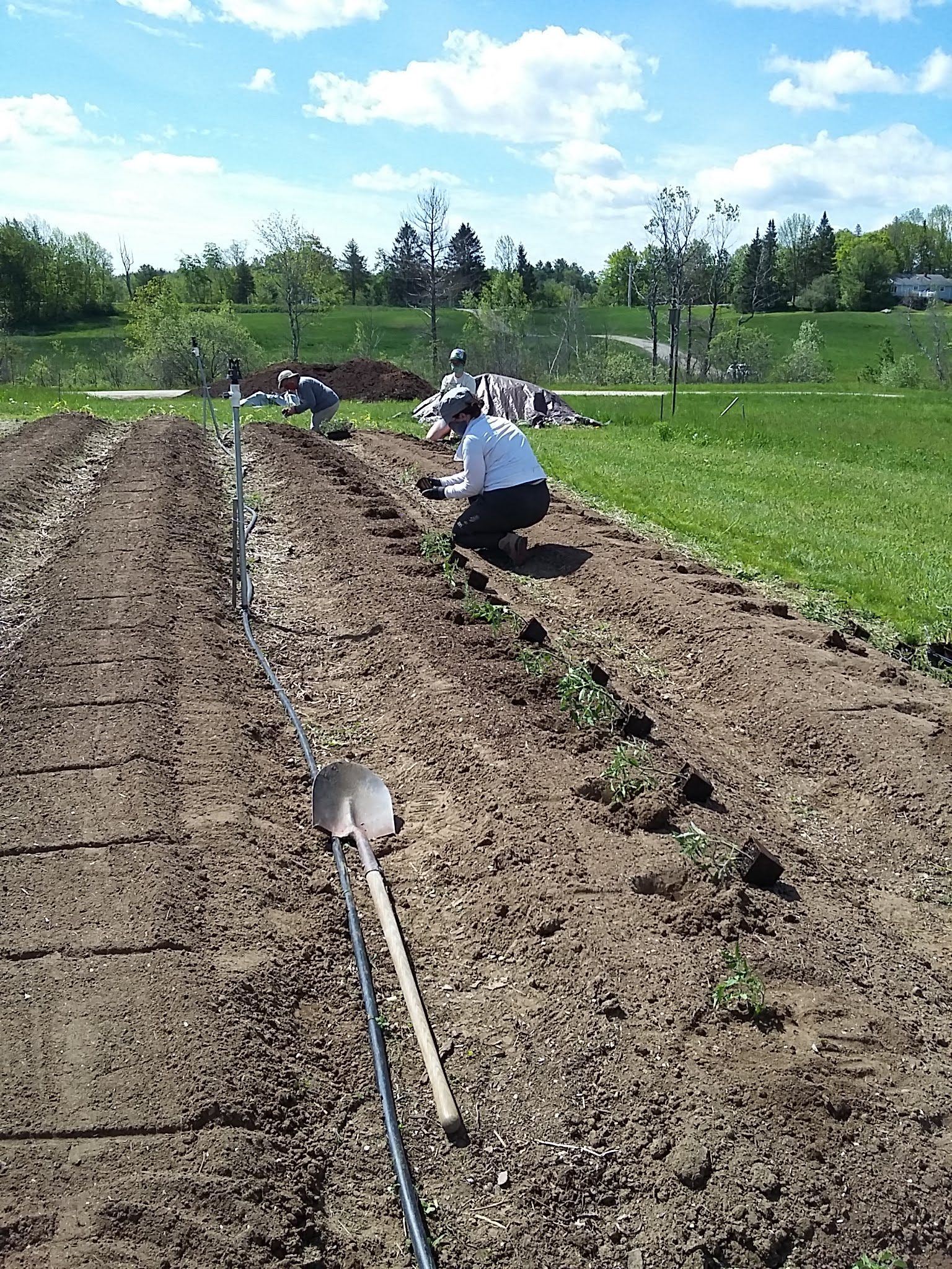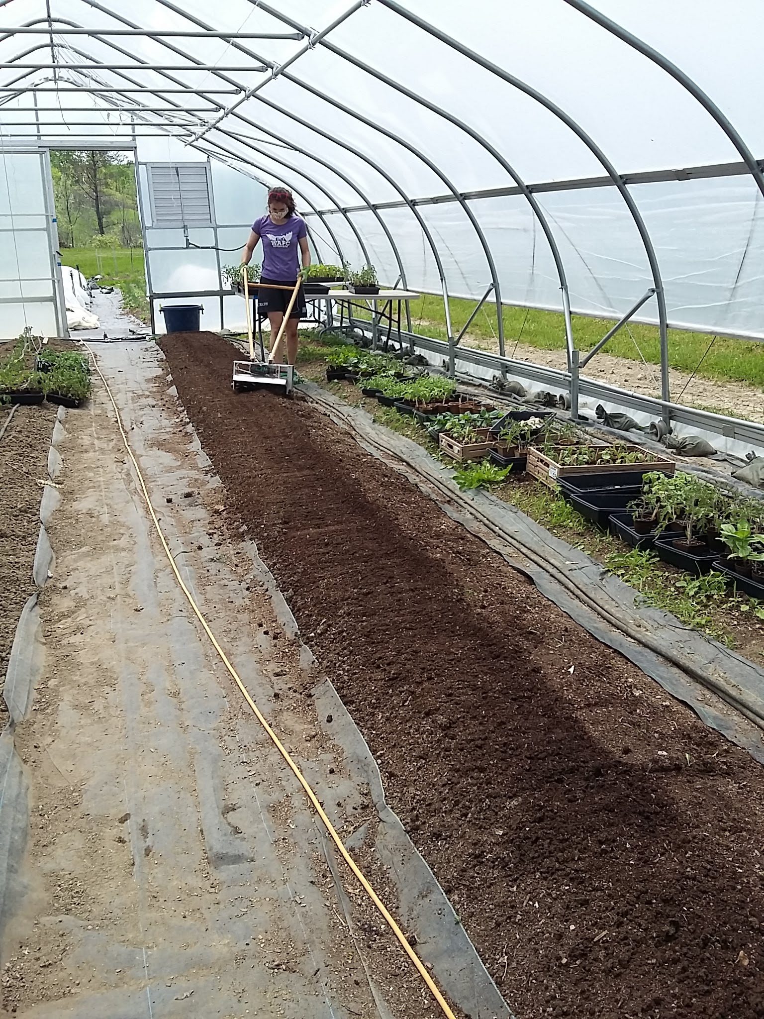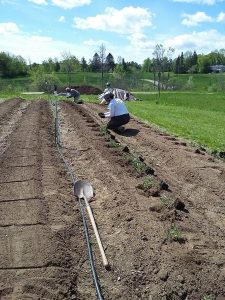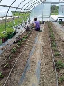 The tomatoes are going in! Adelle used the tilther in the greenhouse to prep the bed and 70 Moskvich tomatoes went in. Outside, an entire plot, (200 feet) went in almost effortlessly. Some light weeding, the tilther, and 2 teams of 4 volunteers planted a mixture of tomato varieties. We were able to use a lot of our own saved seeds this year. A heirloom called Ox Heart produces large tasty summer tomatoes. This year Cherokee Purple is a heirloom we are trialing for possible seed saving for next year.