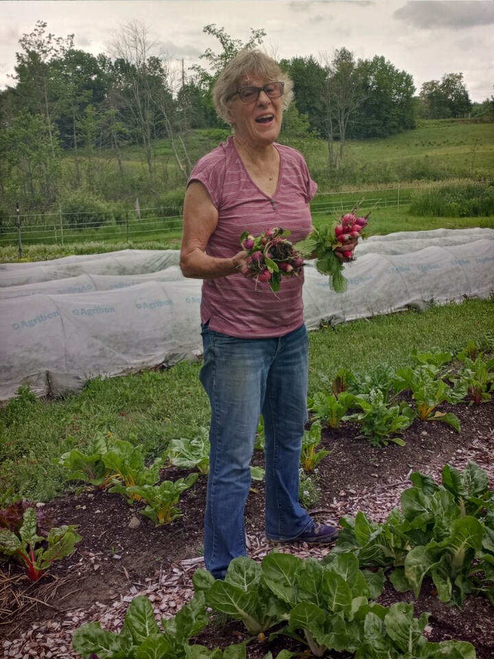 Over 500 pounds of produce was donated this week. The gleaners harvested mostly lettuce with salad turnips, rhubarb and radishes added to the mix. Here is Carolyn with handfuls of radishes that she is finding interplanted with the Swiss chard.