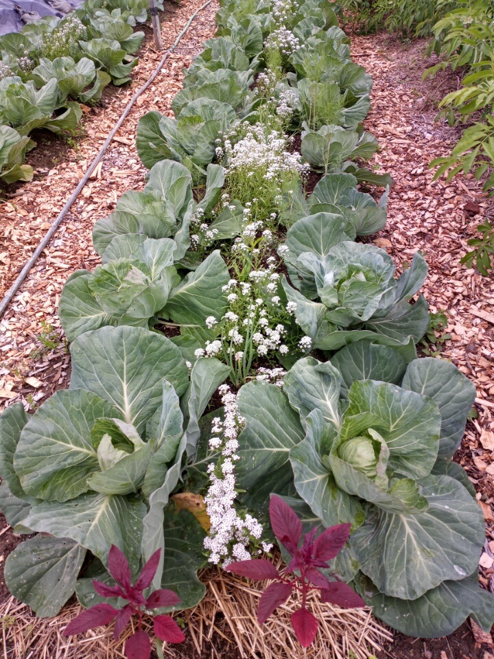 The interplanting of alyssum and cabbage seems to be working well. I have seen very few cabbage moths. We have always had to keep row cover on until harvest to keep those worms from damaging our crop. This year I have seen no sign of damage. The cabbage would not have been happy under row cover with those extreme temperatures we just endured.