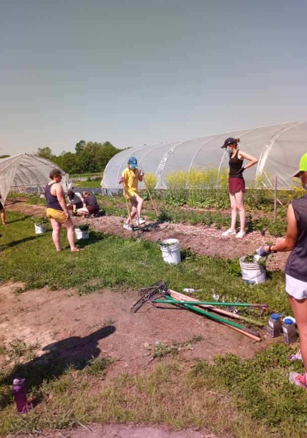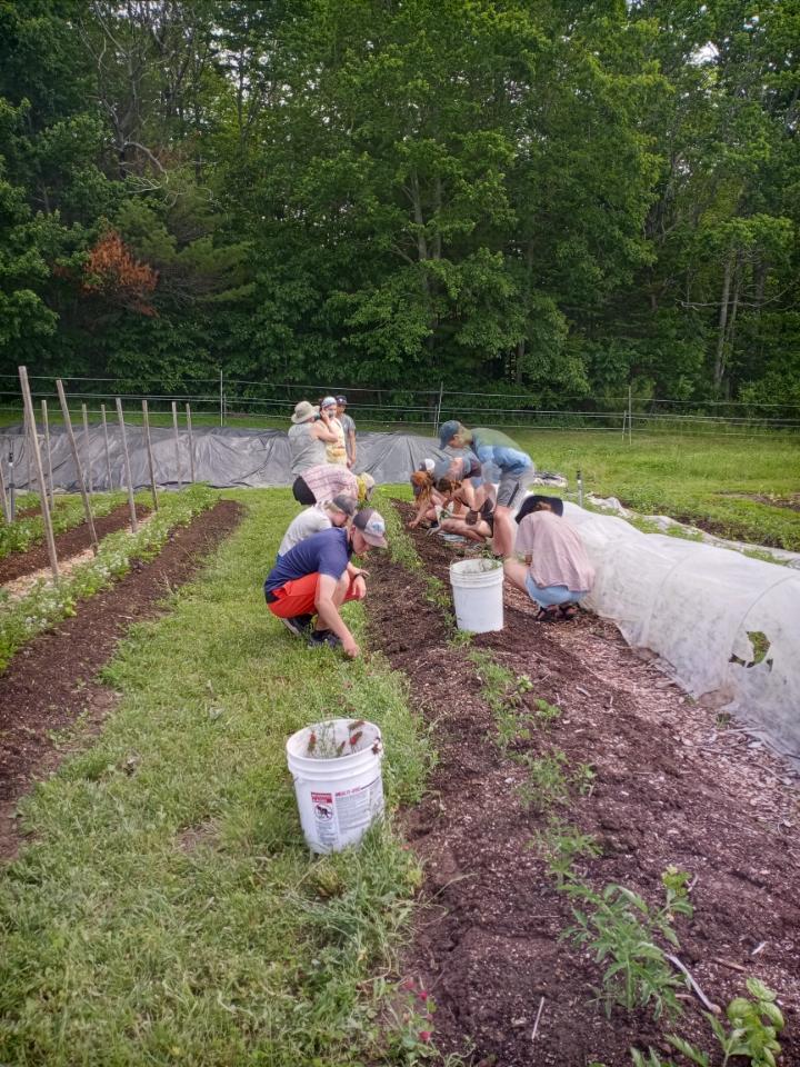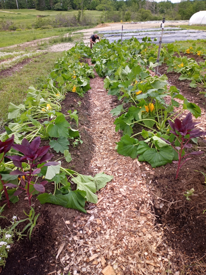 The heat was brutal this week. We had 3 days of excessive heat and 3 days of students volunteering from the Maine Coast High School. Lots of water and breaks under our shade awning kept everyone going throughout the day. Even in those 90 degree temps lots was accomplished. Beds weeded and pumpkins and carrots planted. Our flower garden, for picking your own bouquet, was mulched. Smother tarps were moved and sandbags put in place. Our WWOOFERS and newly arrived Bowdoin College interns ran the show and were great in instructing and motivating the students. A big thank you to all, for such a boost in tackling our to- do-list, in such hot humid weather.