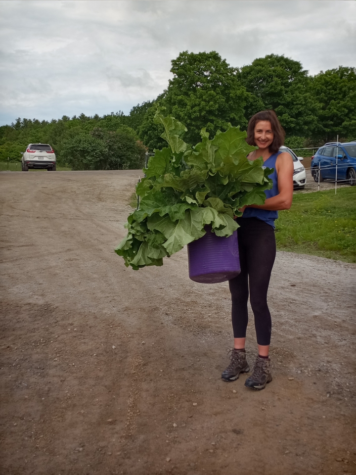 Rhubarb has been a nice addition to our weekly gleaning. Some of the recipients who have been getting it regularly are stocking their freezers. We have harvested over 200 pounds with lots more to pick. It’s last years’ goat straw that seems to have really caused the abundance. I will have to stop saying the goats are just at the farm for the charm factor!