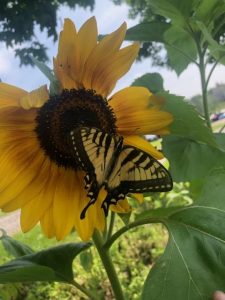 This week we added celery to our mix. Cameron is modeling two large crisp and crunchy bunches. The celery we can grow in Maine is much stronger tasting than the grocery store brand. It’s great in soups and salads. A little goes a long way. Cameron also took a great photo of a Yellow Monarch on one the first sunflowers of the summer.