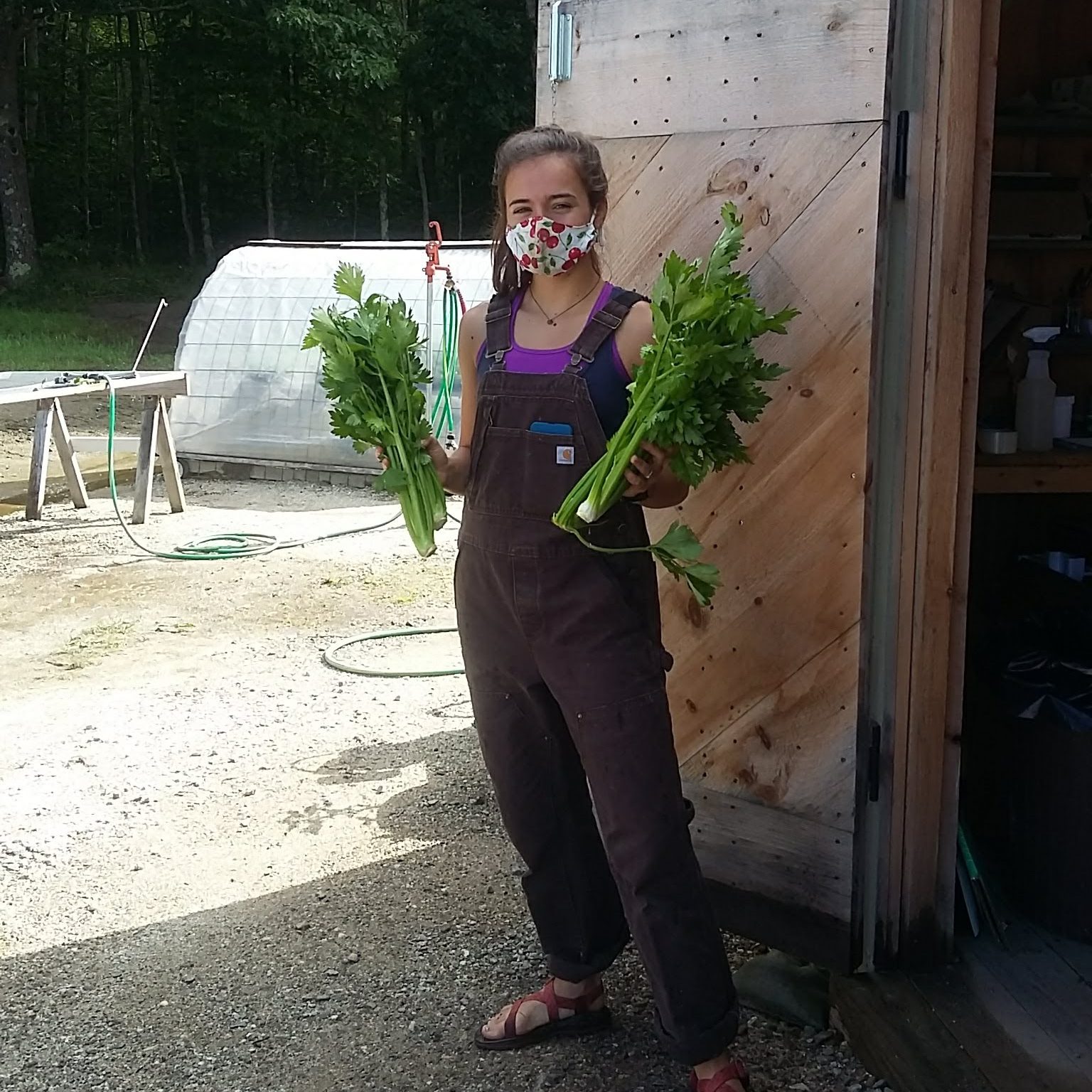 This week we added celery to our mix. Cameron is modeling two large crisp and crunchy bunches. The celery we can grow in Maine is much stronger tasting than the grocery store brand. It’s great in soups and salads. A little goes a long way. Cameron also took a great photo of a Yellow Monarch on one the first sunflowers of the summer.