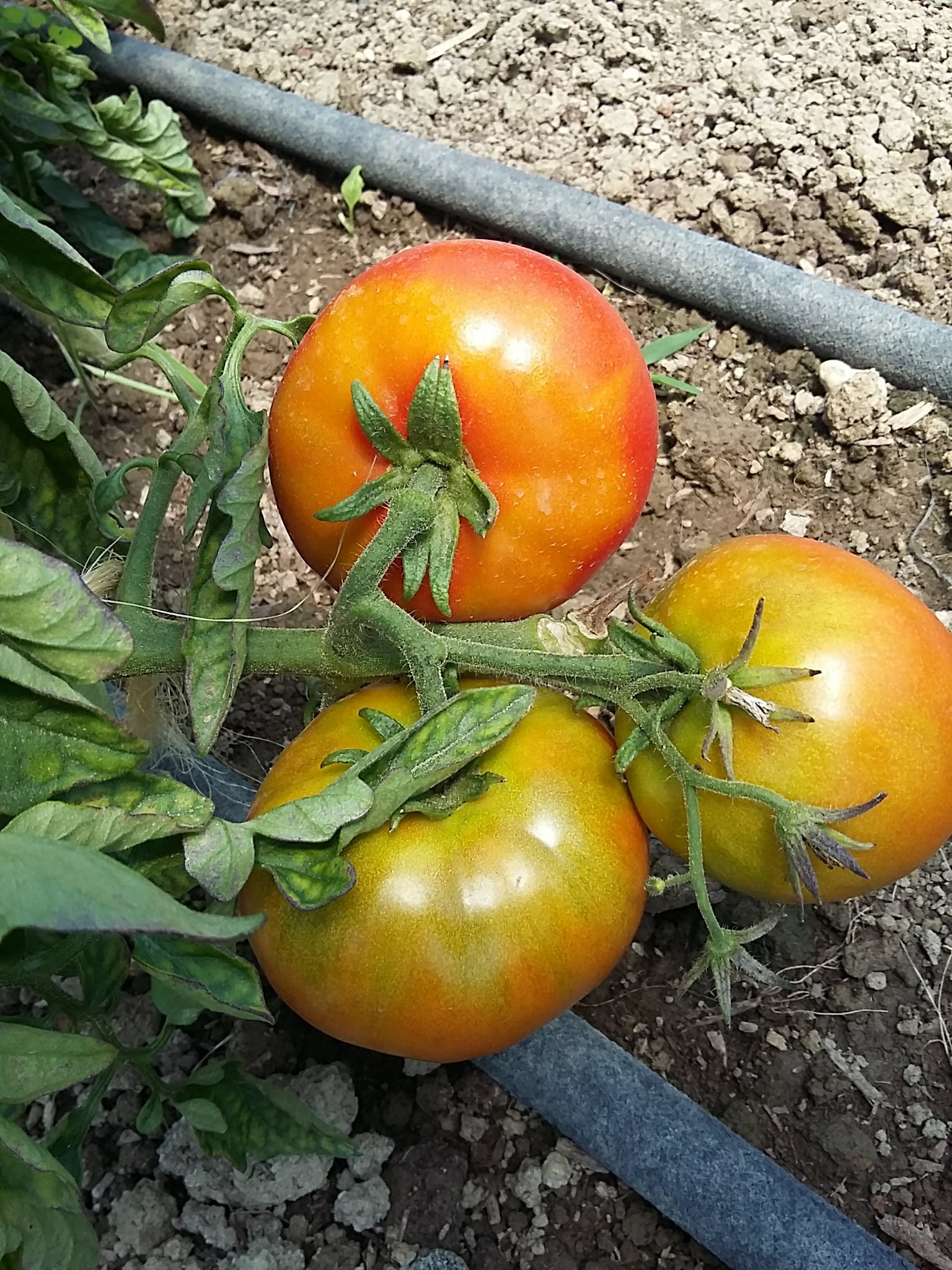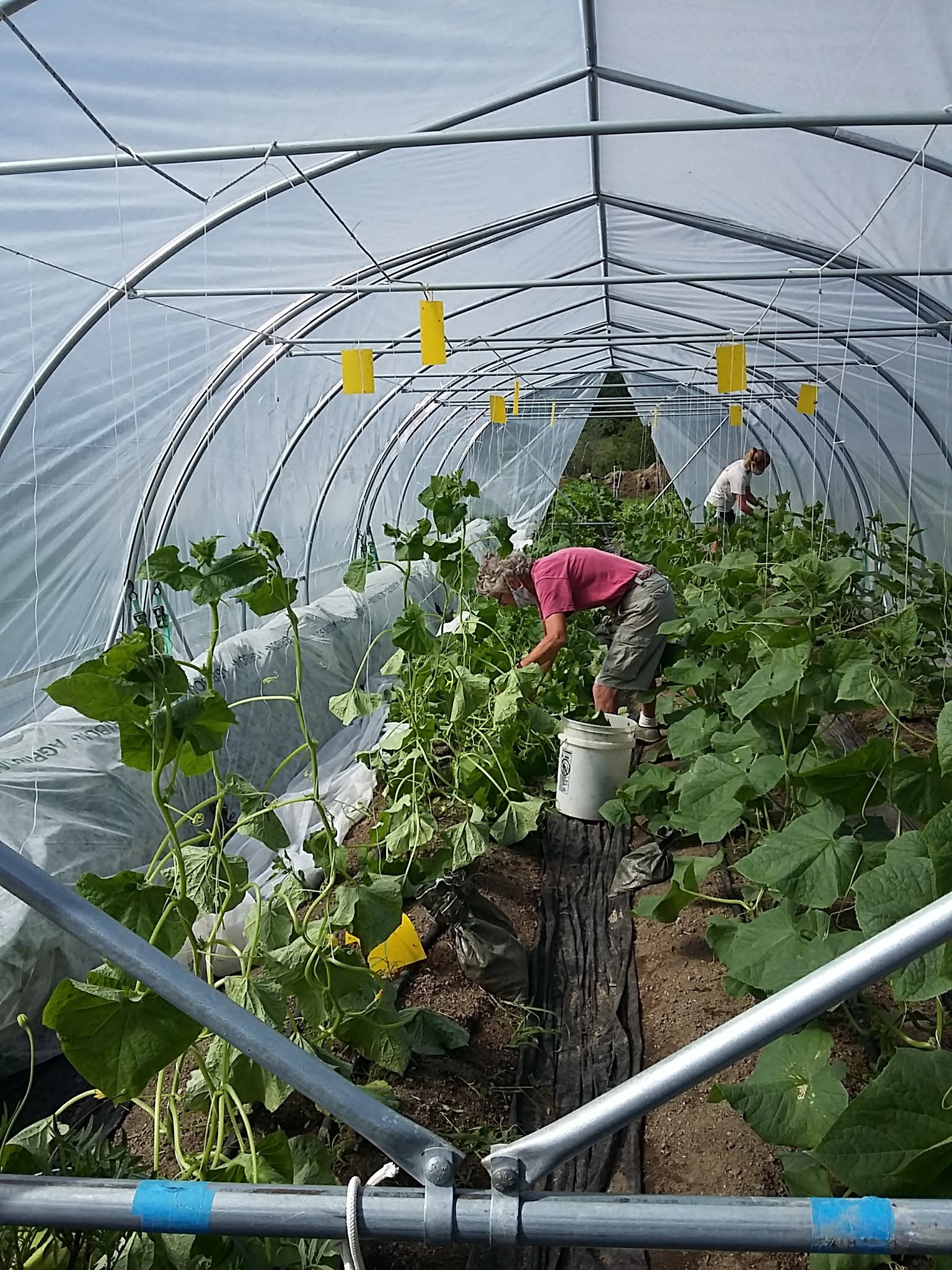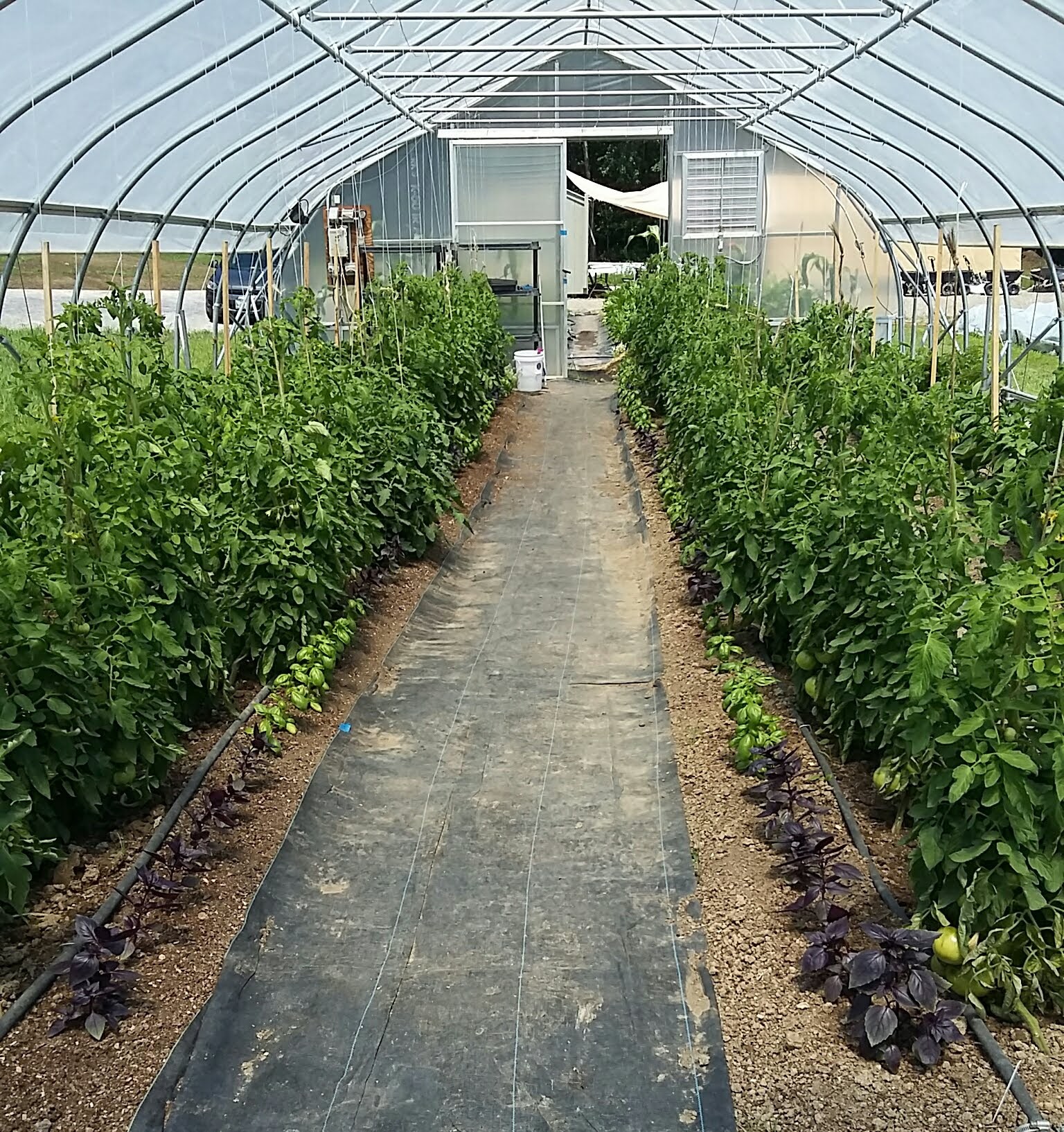 The Tomato greenhouse is looking happy and healthy. We are beginning to have tomatoes turn red. The two colors of basil planted by volunteers one Saturday are making a walk through the greenhouse a visual pleasure. The smells of tomato and basil together bring up so many food journeys.