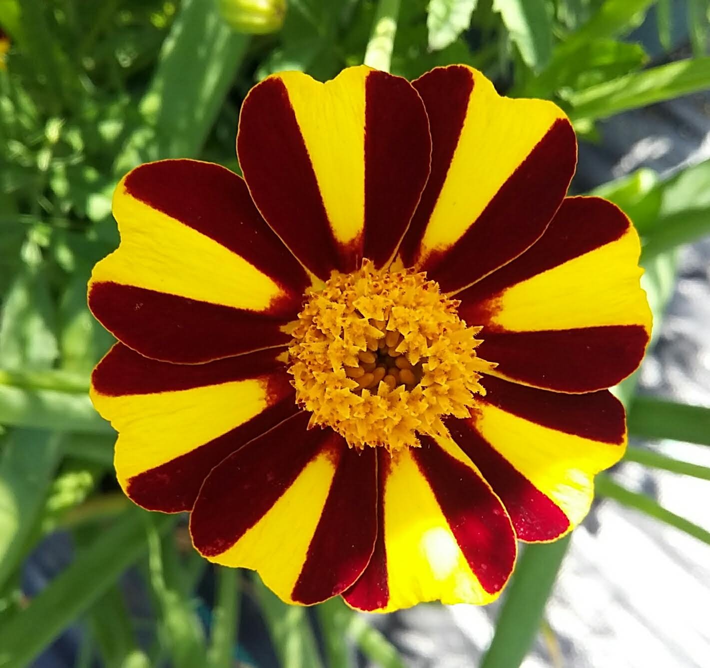 Rebecca and Holly were in the cucumber tunnel guiding the cucumber vines up their designated ropes. They also get heavily pruned as they grow. We had such bad luck with cucumber beetles last year we are trying a couple of new plans of attack. One was spraying a water soluble kelp spray on the foliage every two weeks and the other was to plant marigolds in the entrances to the tunnel. I am not a big fan of marigolds. I appreciate their companion planting properties, but I don’t think they are the prettiest of flowers. Then I found these! Pinwheel Marigold from High Mowing Seed Company. Described as brilliant alternating red and yellow petals on every bloom. Maybe a contender for next year’s plant sale? I am officially a fan of these marigolds.