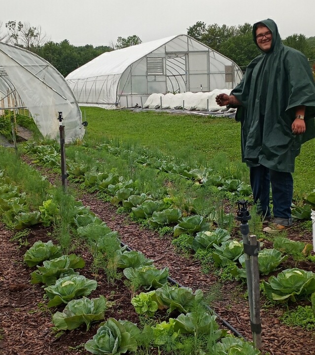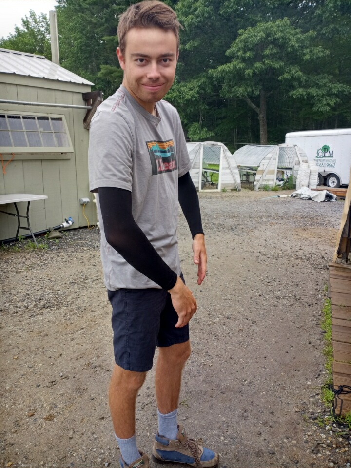Friday’s rain brought out several fashion statements from the crew; Nathan in his Forest Green poncho, and Tucker showing off a new set of harvest sleeves! Very helpful in the cucumber tunnel and squash plots.