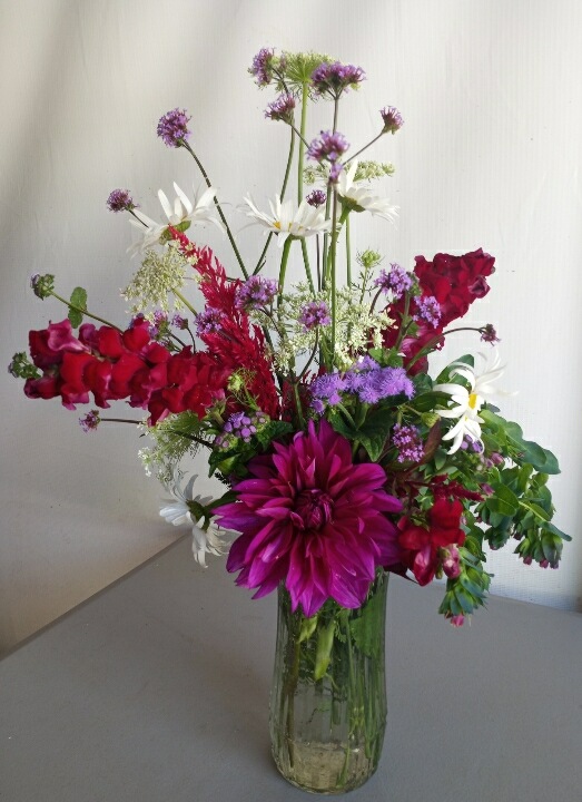 I want to end this week’s report with flowers. Our “Pick Your Own Bouquet” will be up and ready by the end of next week. It will be open Monday through Saturday. We are there from 8am until 2pm but we will leave the clippers and donation box out and available. Here is a bouquet picked and arranged by Carolyn on Saturday, showing off what we currently have blooming in the flower garden.