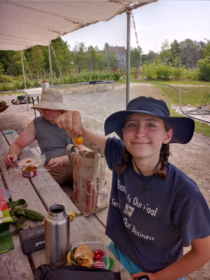 After being gone for 10 days, I was eager to see what impact 3 inches of rain had on the farm. I was most interested in what we could start to harvest. We are starting to see some new vegetables enter our harvest schedule. Our first peppers, cucumbers and scallions are now being donated. Just a few for now, but basket loads in the not too distant future. Nothing better than to see the gleaners’ cars and trucks filled to the max. Grace is showing off our first Sunrise Bumblebee cherry tomato from our tomato “snack bar”.