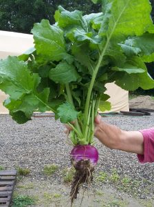 We had three gleanings this week. The new Friday gleaning went to the Harpswell Sharing Table. This week’s boxes included our first turnips and cucumbers! The rest of the box was filled with chard, garlic scapes, and some huge 2-pound heads of broccoli.