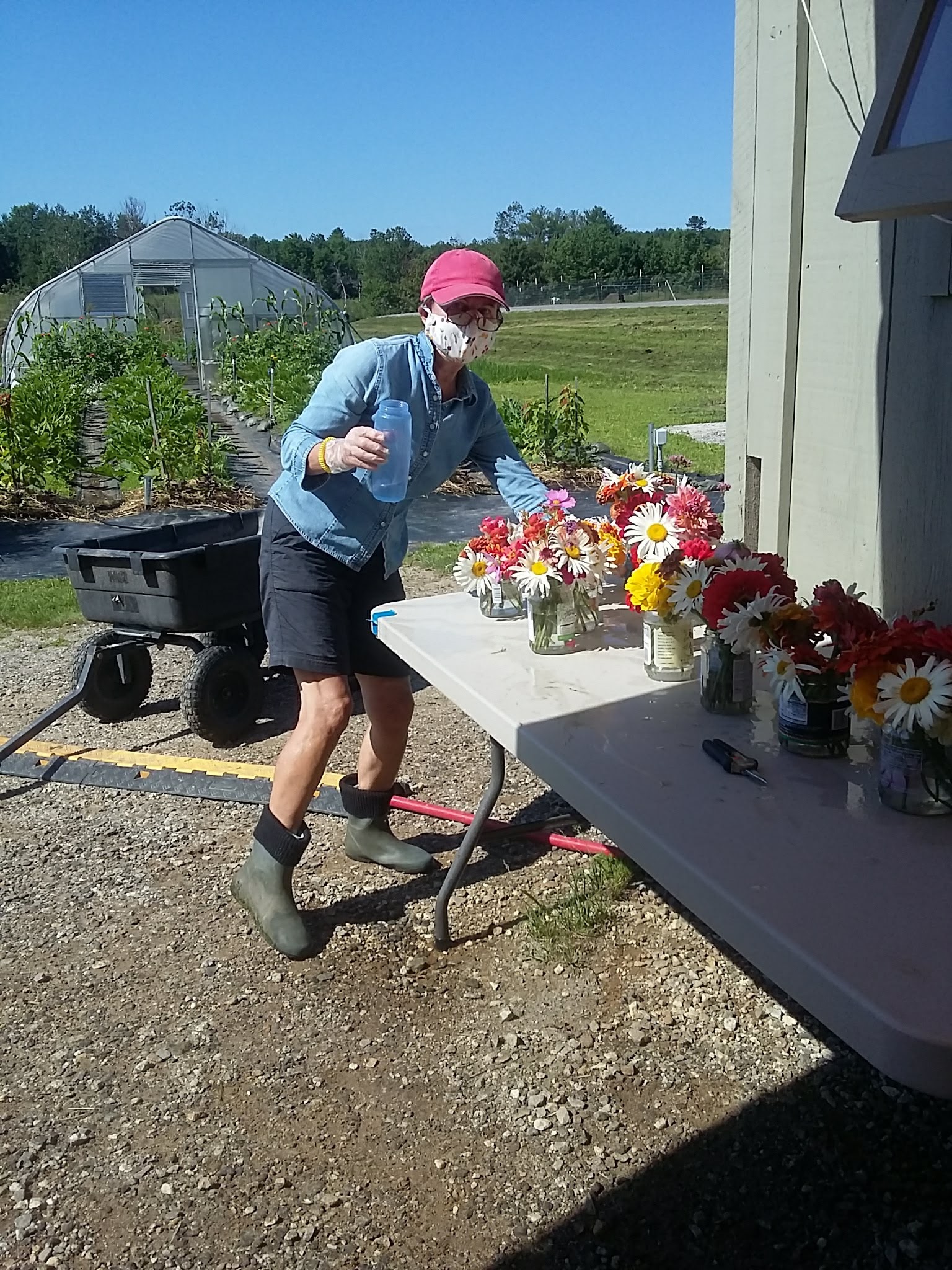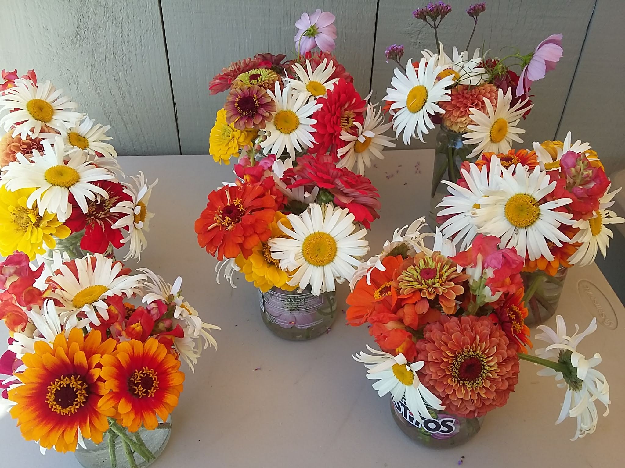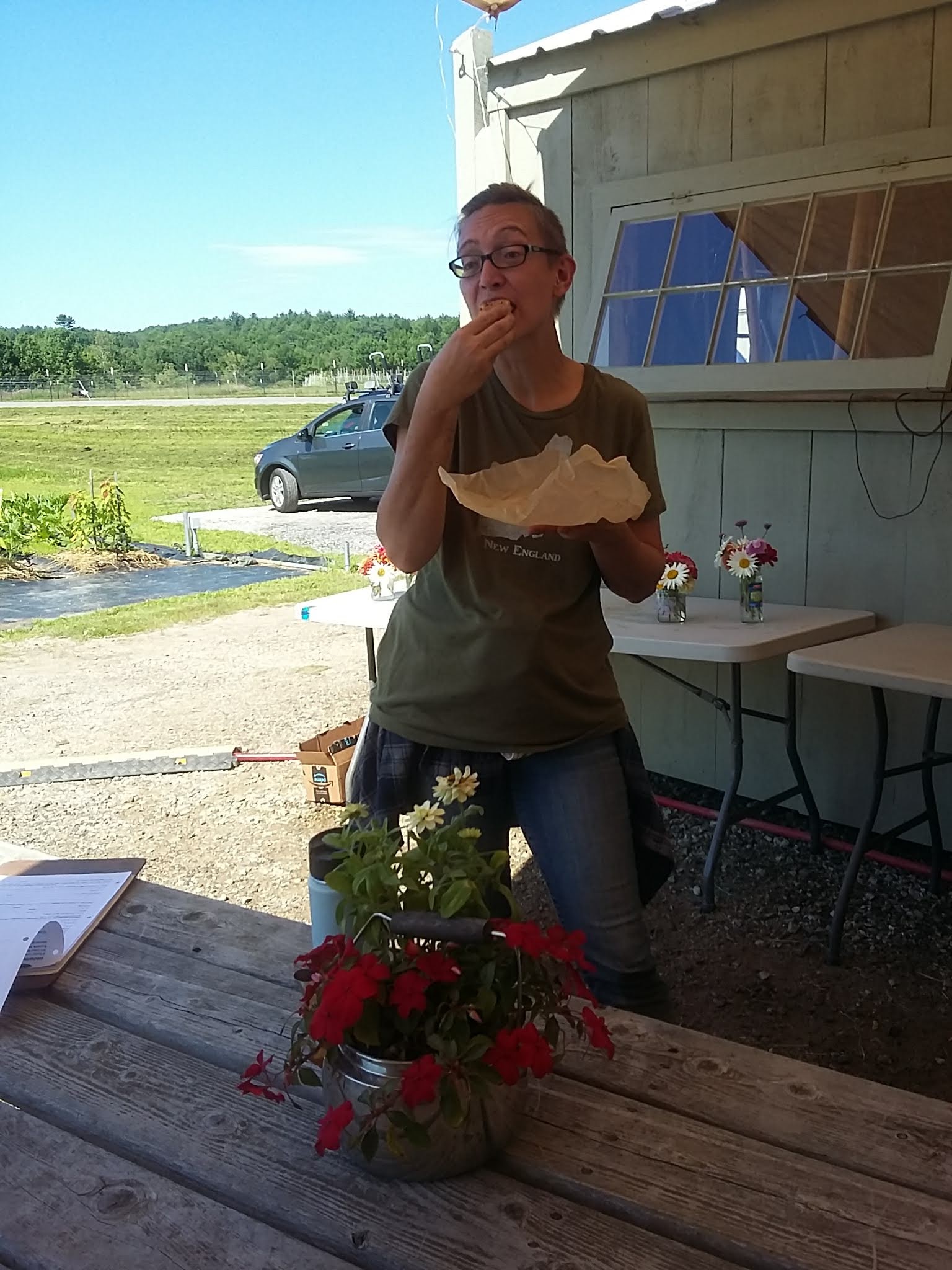 We wanted to share some of our flowers with the Saturday volunteers this week. Brigetta cut and arranged multiple bunches to be given away. Another volunteer baked fresh brown sugar peach scones to be shared by all. See, it’s not always weeding, weeding, weeding at Growing to Give. 🙂
