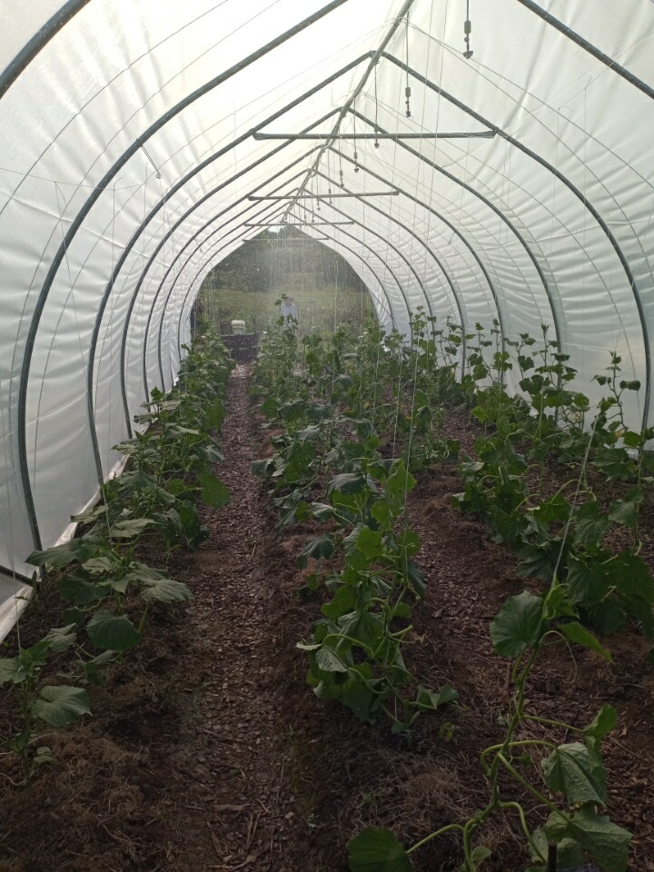 We uncovered our late crop of cucumbers and got them strung up. Some of the Saturday crew finished the job and asked me to turn on our new overhead irrigation while they were in there! It was so hot and humid. I am loving this new overhead irrigation. A big thank you to John and his fix-it team who installed and tweaked it. It is working perfectly.