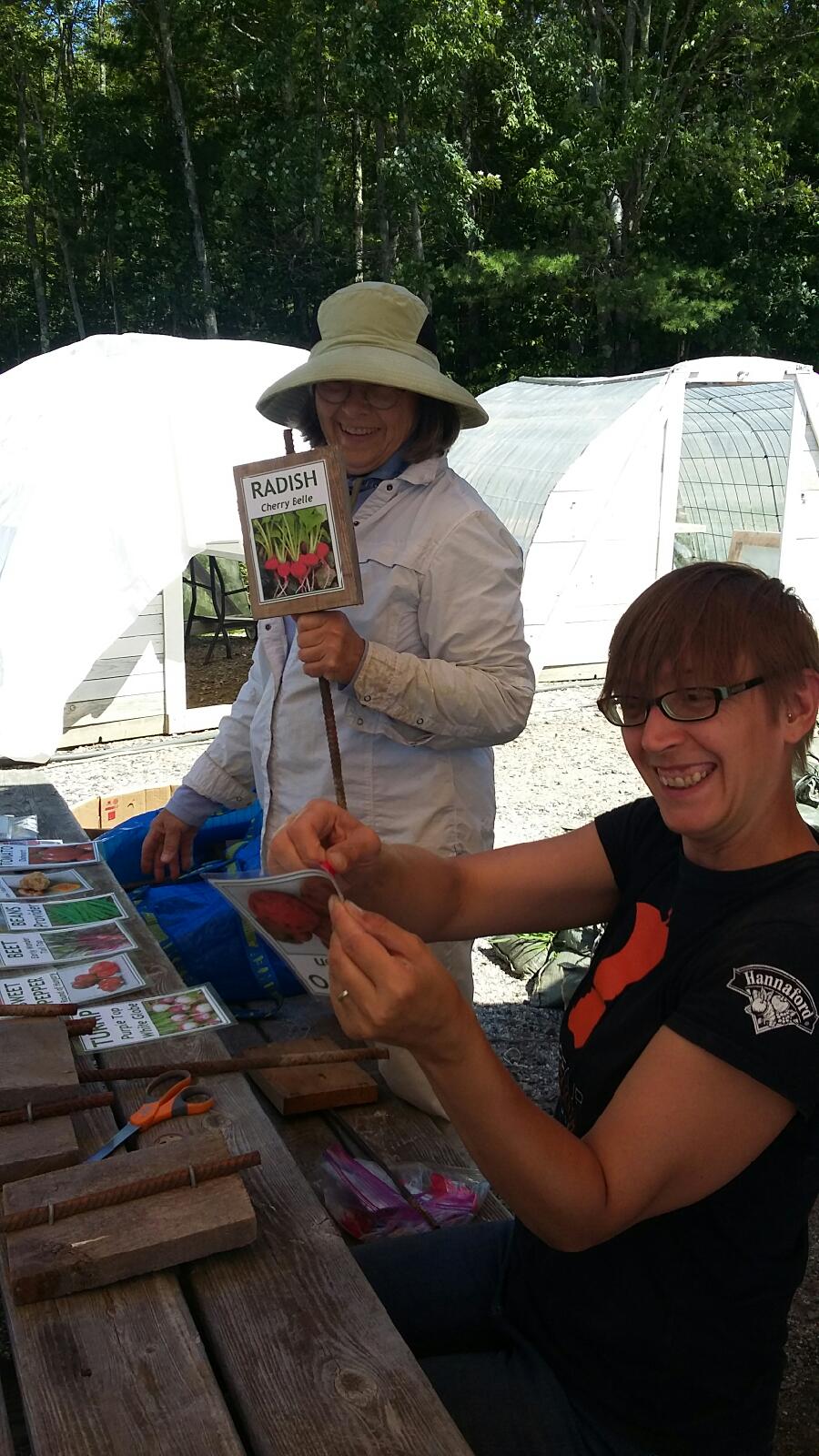 Education is one of our goals and we hope that the farm is a learning experience for all visitors. Cathy, a twice-a-week volunteer who is also a board member, is being helped by Karin to set up photos to ID vegetables. I think Cathy has created a real tool for anyone going on a self-guided tour of the farm.