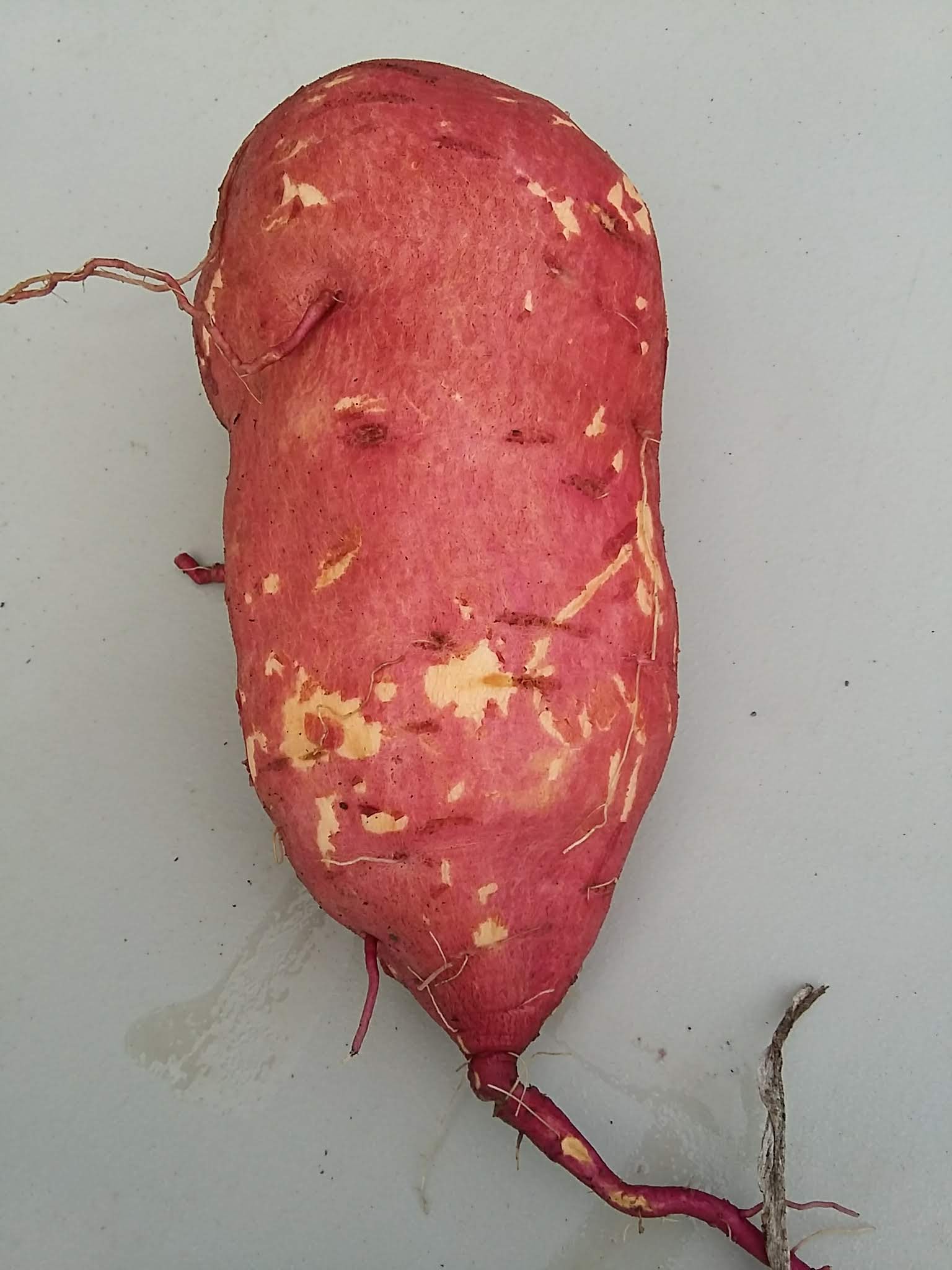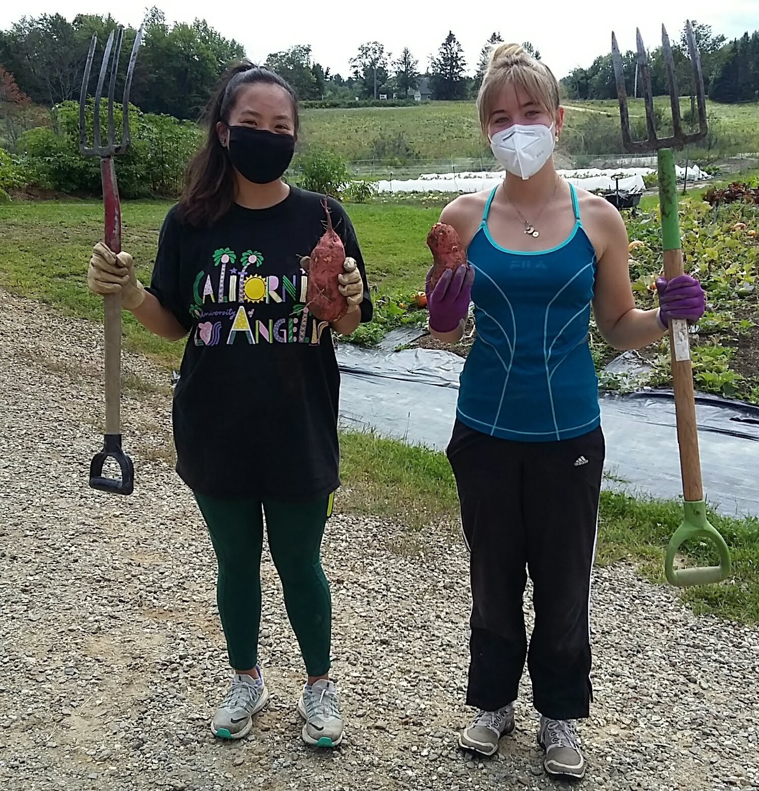In addition, we still have 10 other vegetables on our harvest schedule. This week we took a peek at our sweet potato plot and this is what we found. Our two newest WWOOFERs, Aly and Ellie, are holding up examples of sweet potatoes weighing in at 1.5# or more!