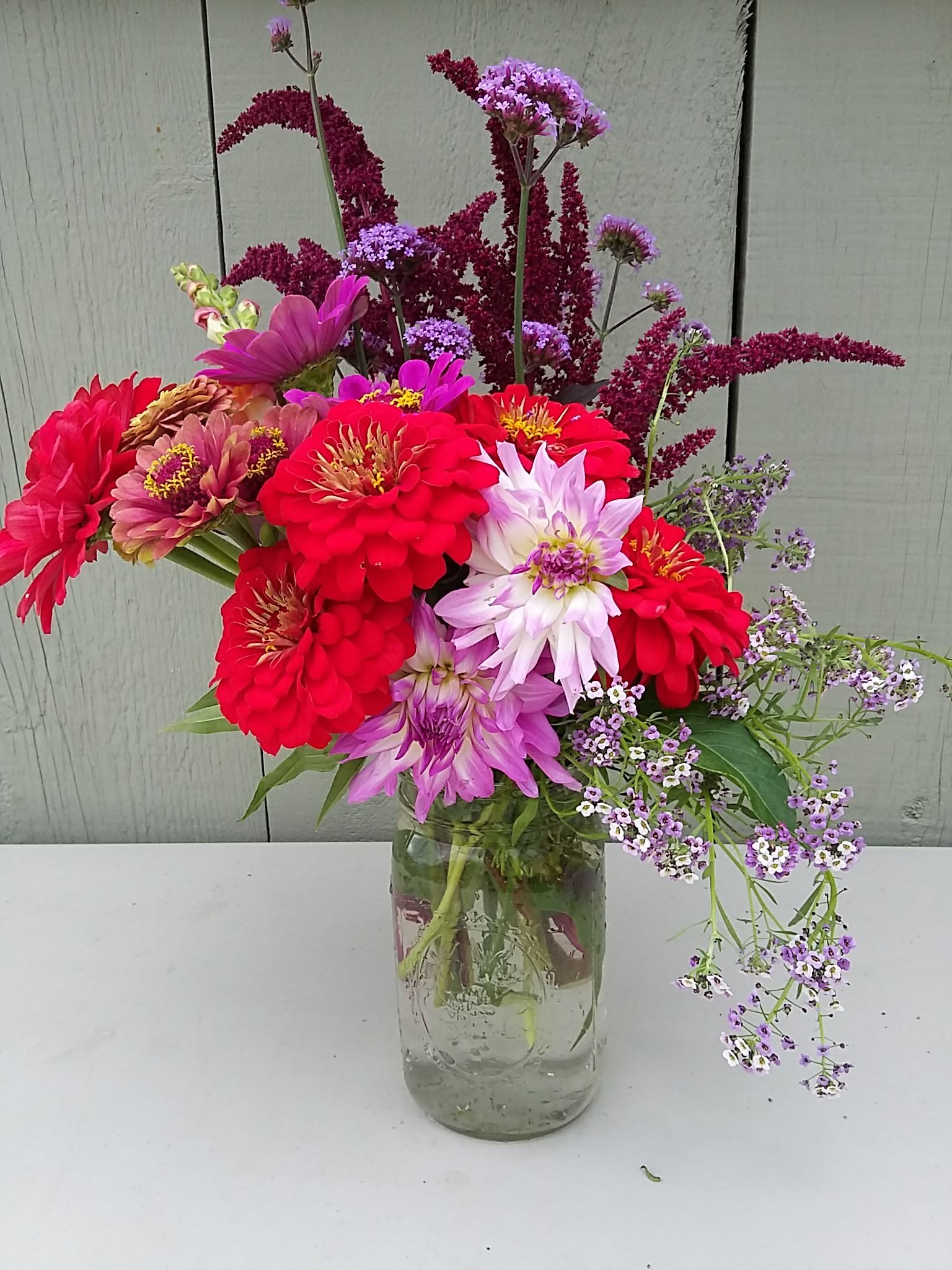 Here is an example of this weeks’ pick a bouquet. These flowers are still blooming strong and we will have them for a few more weeks. If you want a large dramatic bouquet, come pick some amaranth, broom corn, and sunflowers.