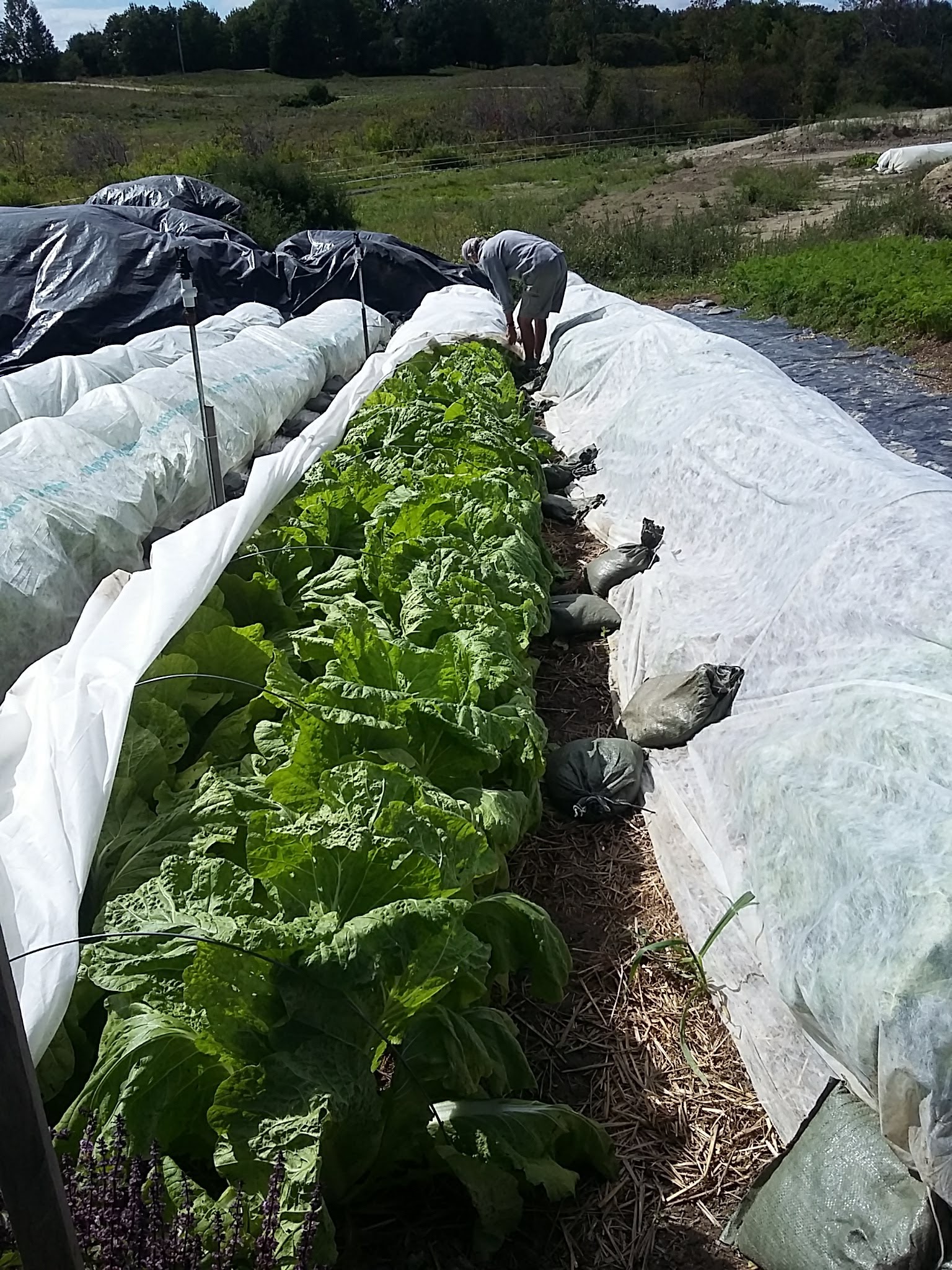We are now in transition here at the farm. Going from harvesting the end of our warm season crops to planting and harvesting cool weather crops. Our 2# plus Oxheart tomatoes are still producing, our fall lettuces are ready to eat, and the newest plot of Nappa cabbage is being harvested.