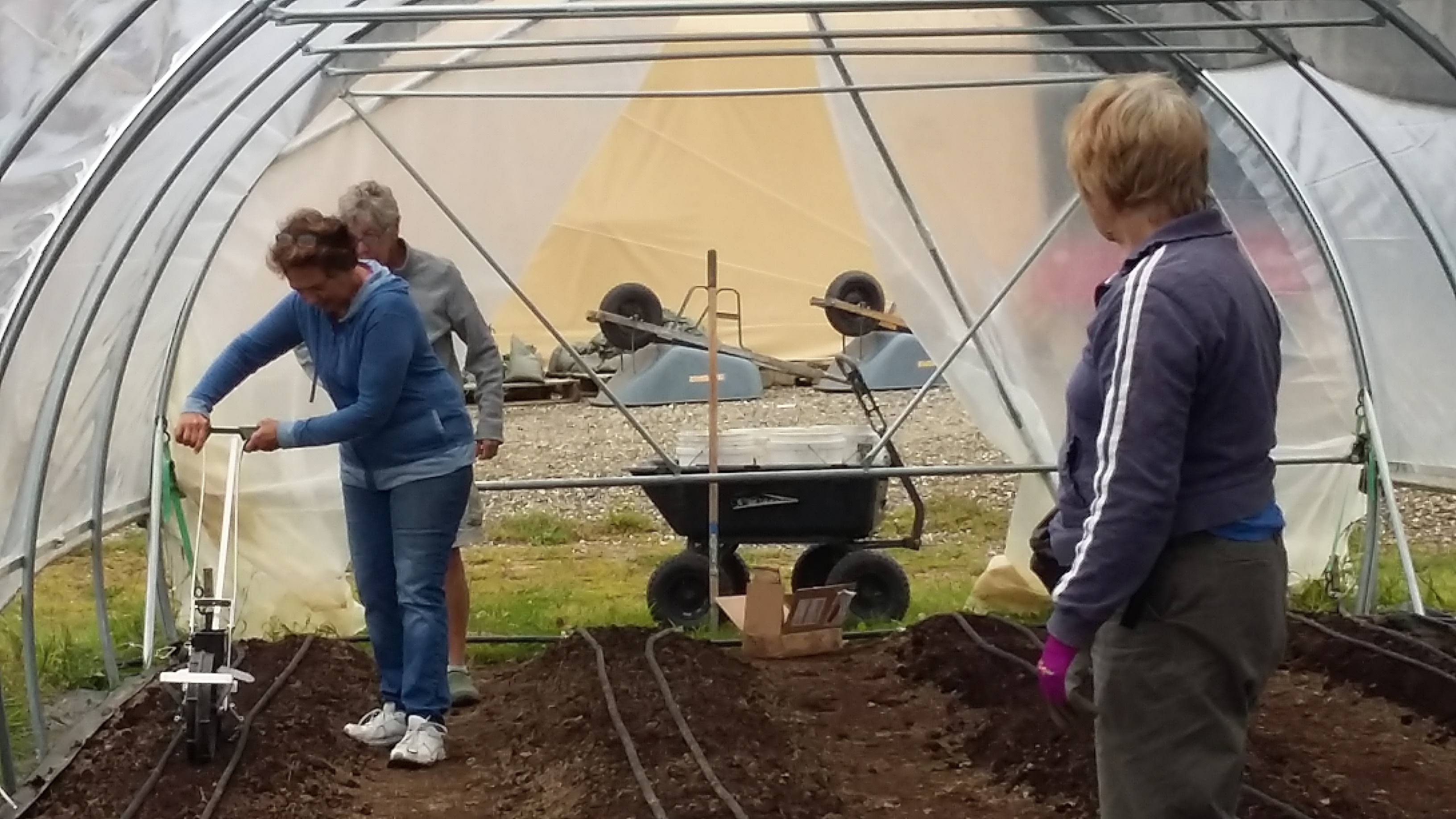 This week was bittersweet, starting to harvest the acorn squash and putting in an entire tunnel of spinach. That is it for planting for this season, the spinach will be ready mid-October and, with the extra protection, hopefully, the harvest will last a couple of weeks. Then as the days lengthen and the sun is higher in the sky the spinach should start to wake up and begin to grow again in mid to late February. Kathy and Judy tried out our seeder on the spinach beds and were amazed at its simplicity. The joke was that there should be notices at different locations such as: Planted by Kathy and Judy, Weeded by The Saturday Crew, etc.!