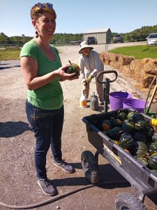 The first of the winter squash was picked. Here is Leigh Ann with a wagon load of Acorn squash ready to rinse and send off to recipients. Many more varieties will be ripening over the coming weeks.