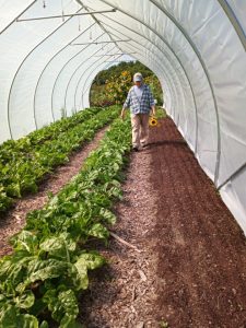 We are also still planting and nurturing cool weather crops for fall harvest. Part of our mission is to extend the season with our new tunnels and under row covers. Cathy is admiring a tunnel full of Swiss chard and Japanese salad turnips. This coming week we will be planting more lettuce and spinach. Our fall cabbage crop is extraordinary, but I don’t want to talk about the Fall Broccoli. 🙁